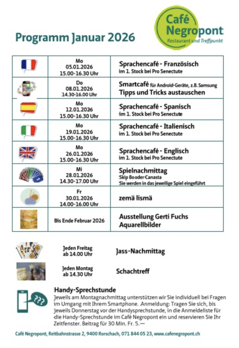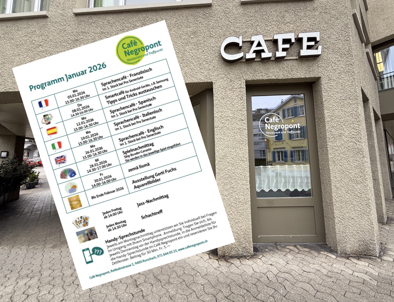 Das Januar-Programm im Café NegropontThemen:BeizenKulturRorschach 4. Januar 2026 - 05:10Mehr Infos rund um das breite Angebot im Café Negropont findet man immer hier und hier.Teilen mit: Einen Link per E-Mail an einen Freund senden (Wird in neuem Fenster geöffnet) E-Mail Drucken (Wird in neuem Fenster geöffnet) Drucken Auf Facebook teilen (Wird in neuem Fenster geöffnet) Facebook Auf X teilen (Wird in neuem Fenster geöffnet) X Auf WhatsApp teilen (Wird in neuem Fenster geöffnet) WhatsApp Gefällt mir:Gefällt mir Wird geladen …Newsletter abonnieren Bitte dieses Feld leer lassenBitte wähle, ob Du über jeden neuen Beitrag sofort oder lieber jeden Morgen gegen 9 Uhr eine Zusammenfassung der neusten Beiträge erhalten möchtest.Liste(n) auswählen: Neues vom Echo (Zusammenfassung) Neues vom Echo (Sofortbenachrichtigung) Dieses Feld wird benötigt.Prüfen Sie Ihren Posteingang und den Spamordner, um Ihr Abonnement zu bestätigen.