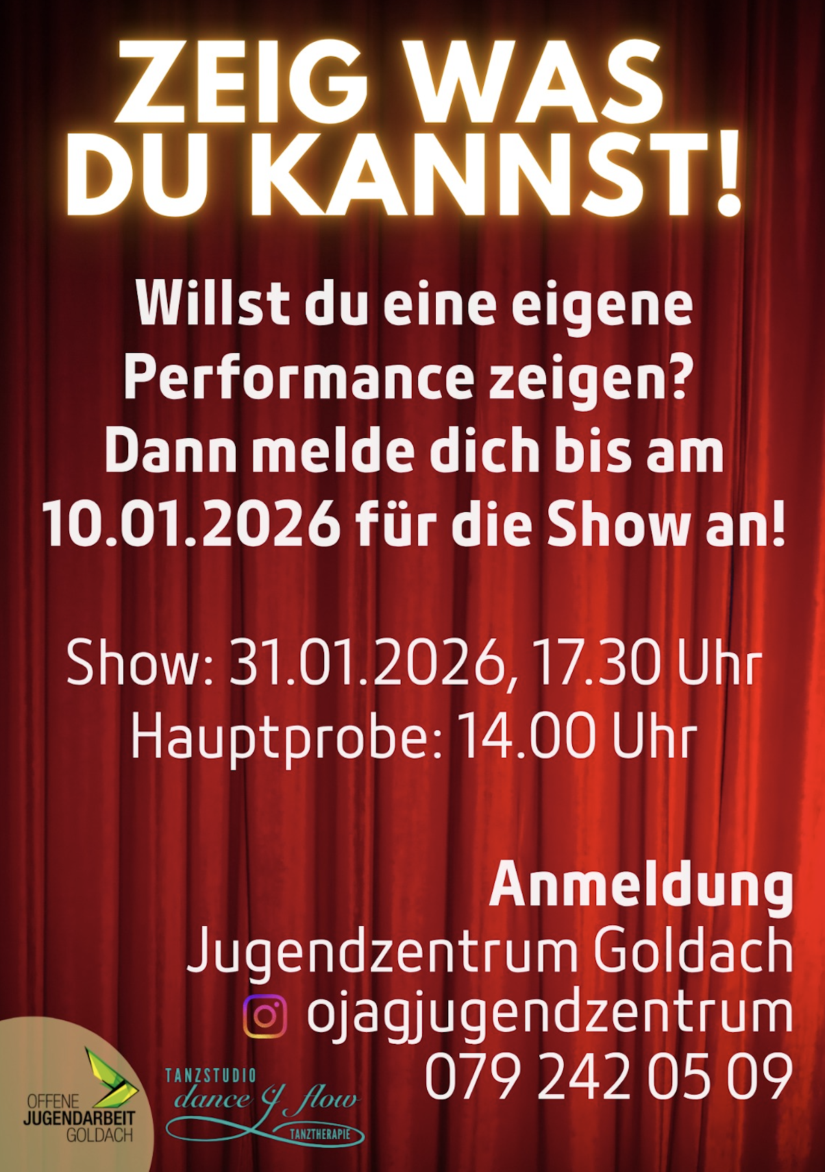 Besonders bei Mädchen und jungen Frauen zeigt sich immer wieder ein Bedarf nach Dance-Workshops. Diese werden meistens im Rahmen von der Frauenzeit oder Ferienprogrammen angeboten. Da die Plattformen für Auftrittsmöglichkeiten kaum vorhanden sind, möchten wir Kindern und Jugendlichen die Gelegenheit bieten, ihr Können auch mit ihren Freunden*innen und der Familie zu teilen. Während den Sportferien bieten wir vom 28. – 30. Januar ein Dance Camp im Tanzstudio & Tanztherapie dance4flow in Rorschach an. In diesen drei Tagen werden gemeinsam Choreographien einstudiert und Hilfestellungen zur eigenen Kreativität gegeben. Am Samstag, 31. Januar folgt dann das Highlight – die öffentliche Dance Show in der Aula Goldach. Bereits bestehende Tanzformationen und Tanzklassen dürfen die Bühne nutzen. Aber auch Anfänger, welche beispielsweise am Dance Camp teilnehmen, haben die Möglichkeit am Anlass aufzutreten.