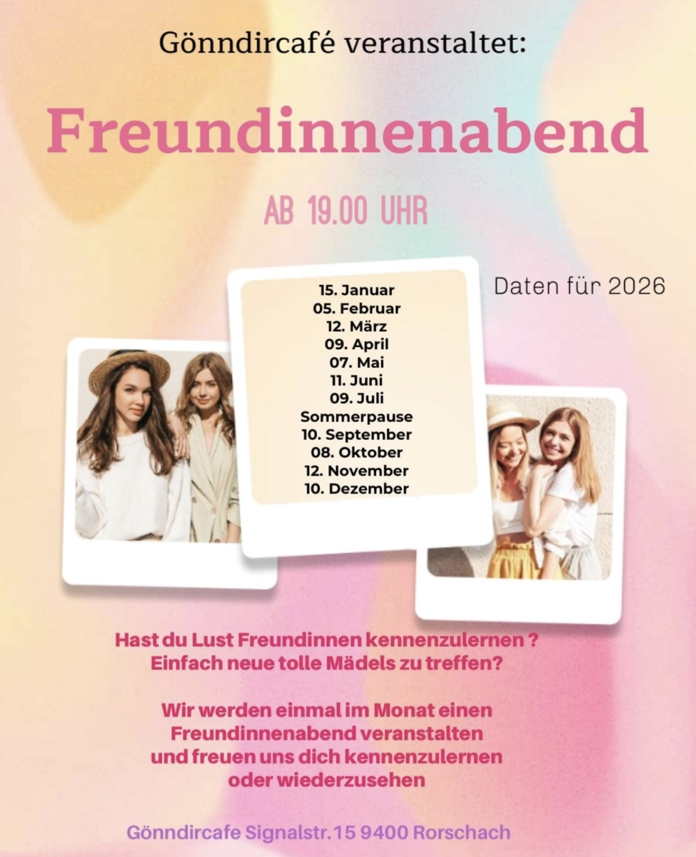 Das GönnDirCafé in Rorschach bietet auch 2026 einen „Freundinnenabend“ an. Die wichtigsten Infos findet man auch dem Flyer unten. Start ist heute Donnerstag.