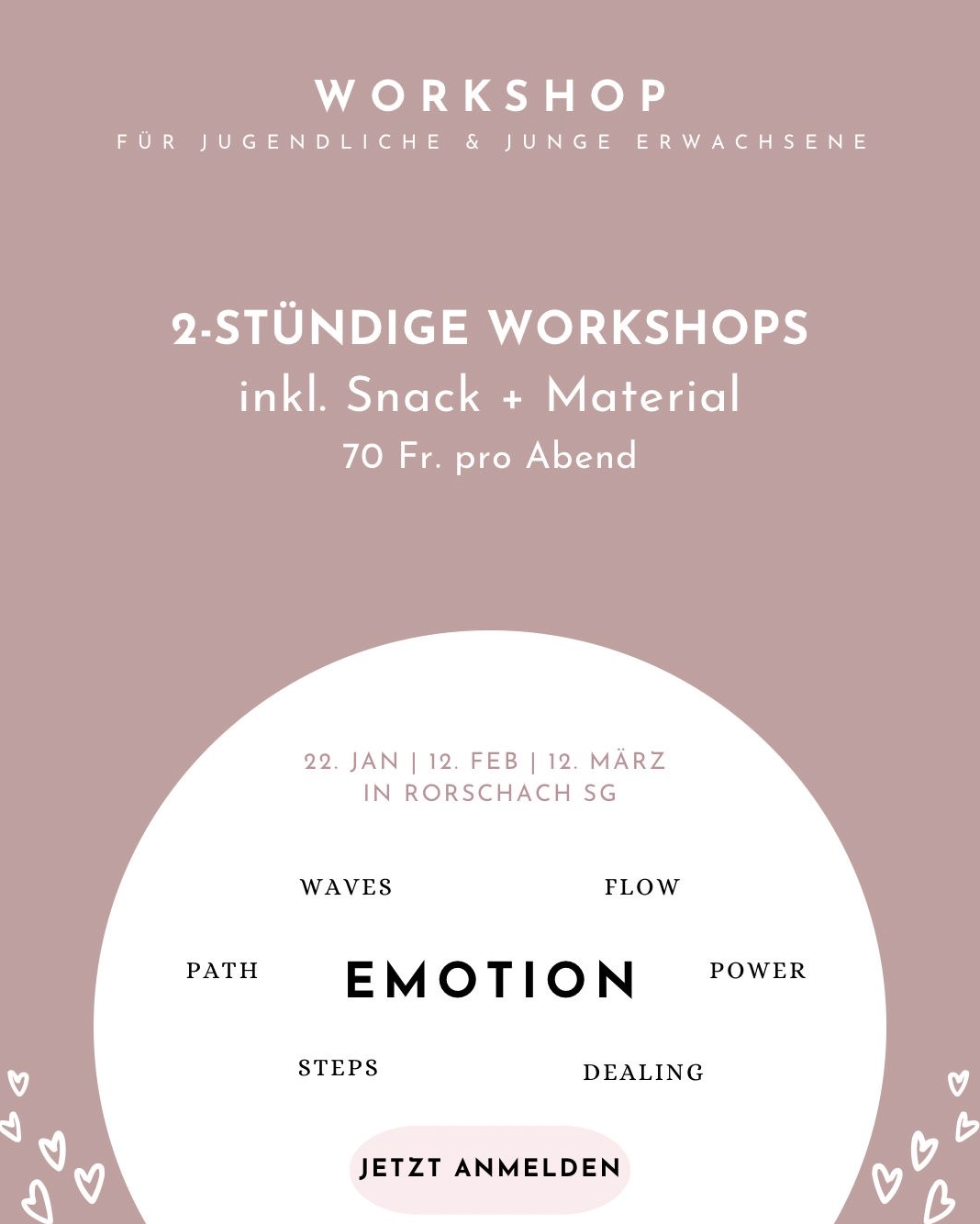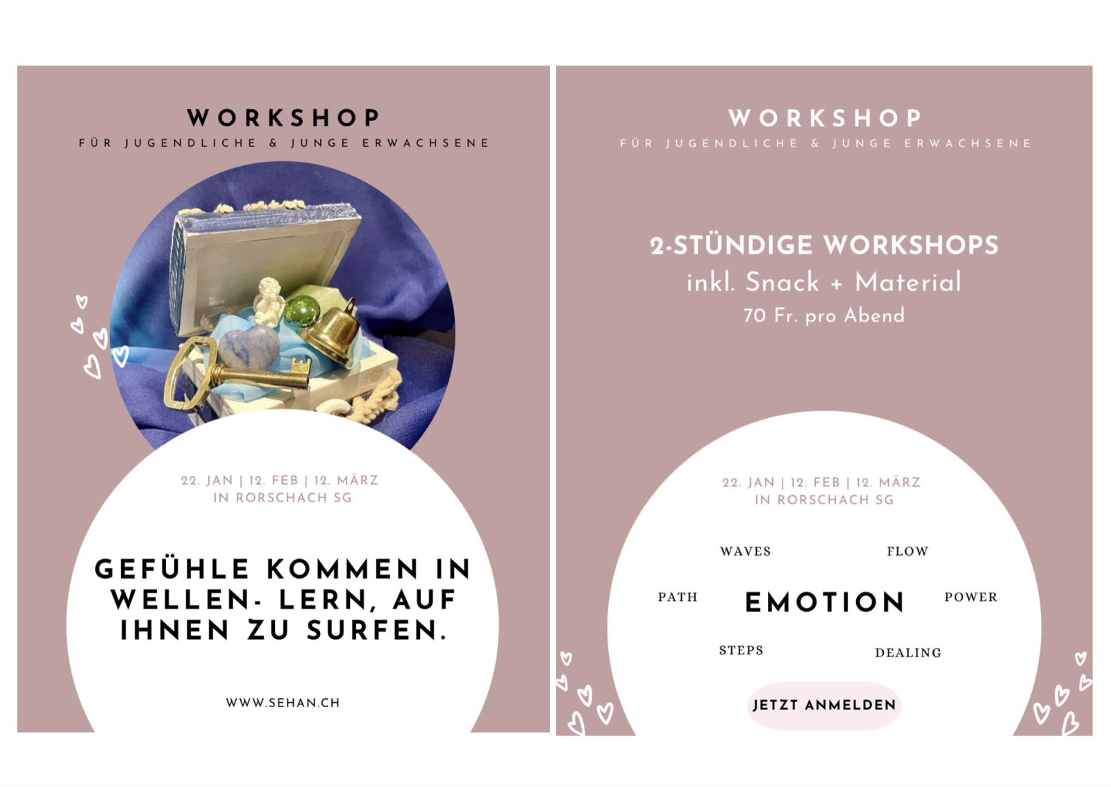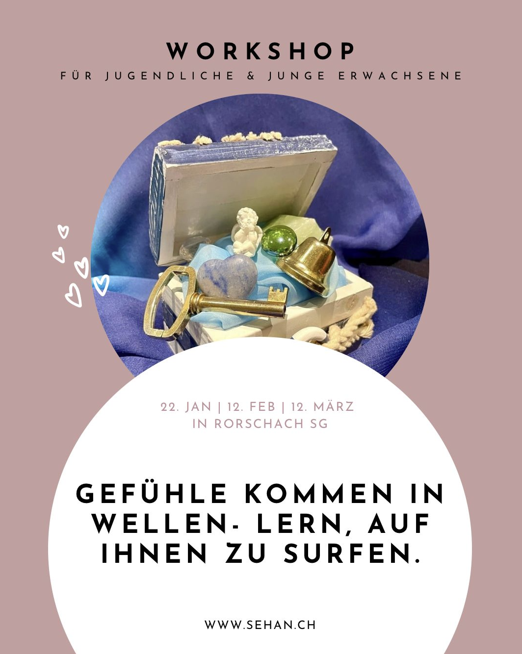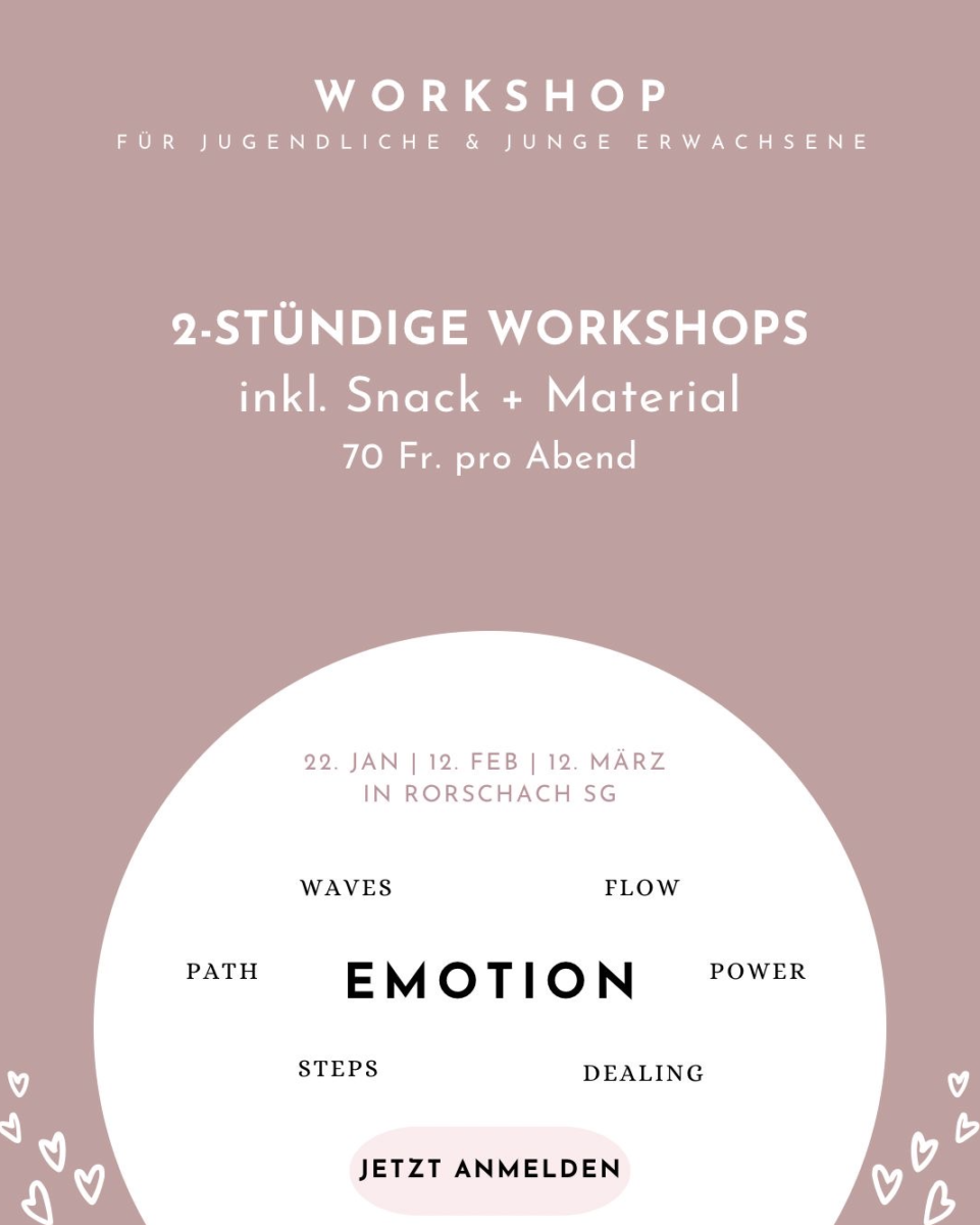Isabel Spirig und Marion Götte bieten in Rorschach an der Trischlistrasse 14 einen Workshop für Jugendliche und junge Erwachsene an, die gerne an ihren Emotionen arbeiten möchten. Sehr geeignet ist der Kurs für Menschen, die einen Verlust erlitten haben (zB Trennung, Tod, Krankheit). Der Workshop startet am 22. Januar. Mehr zu sehan.ch findet man auch hier.