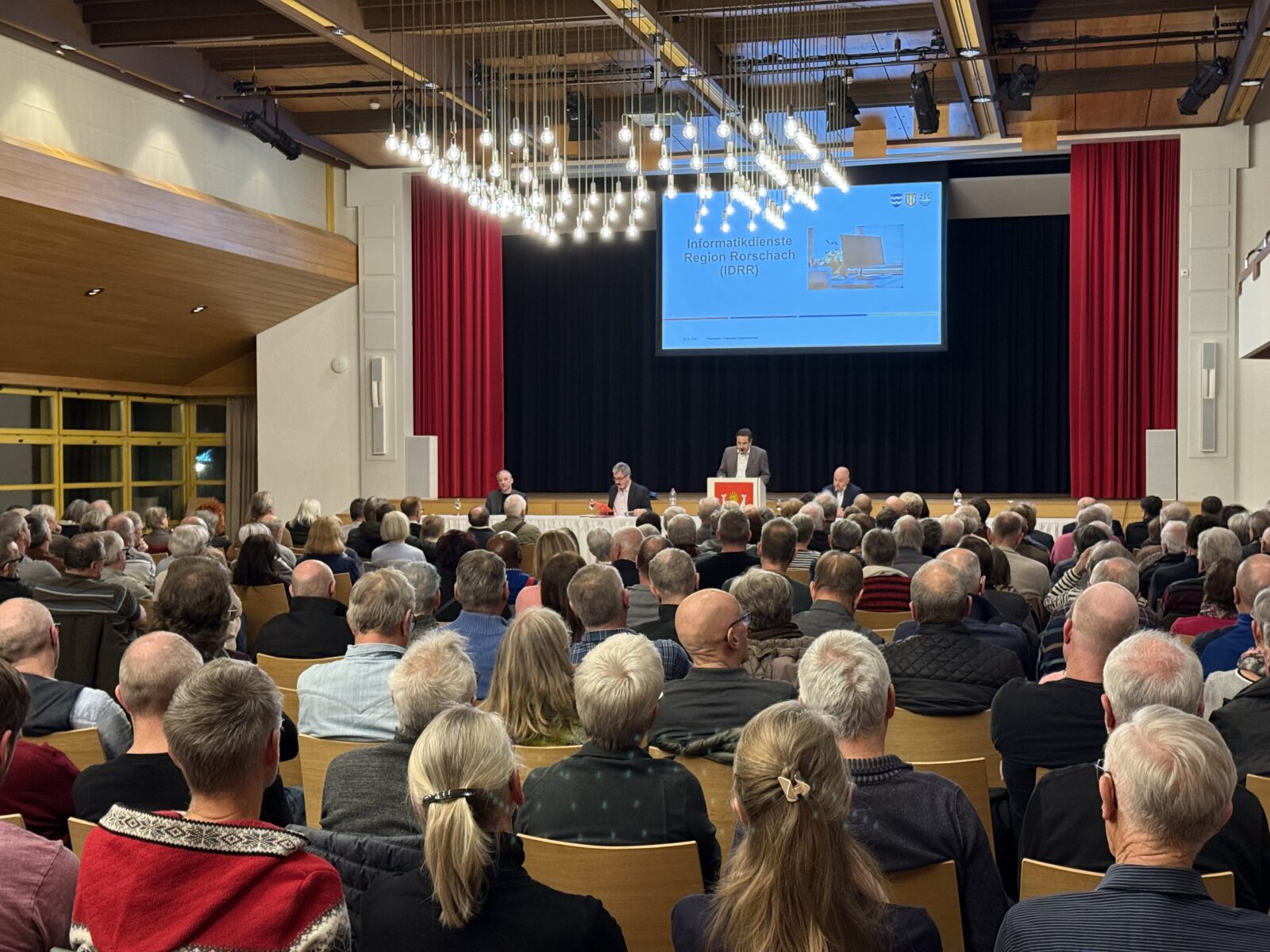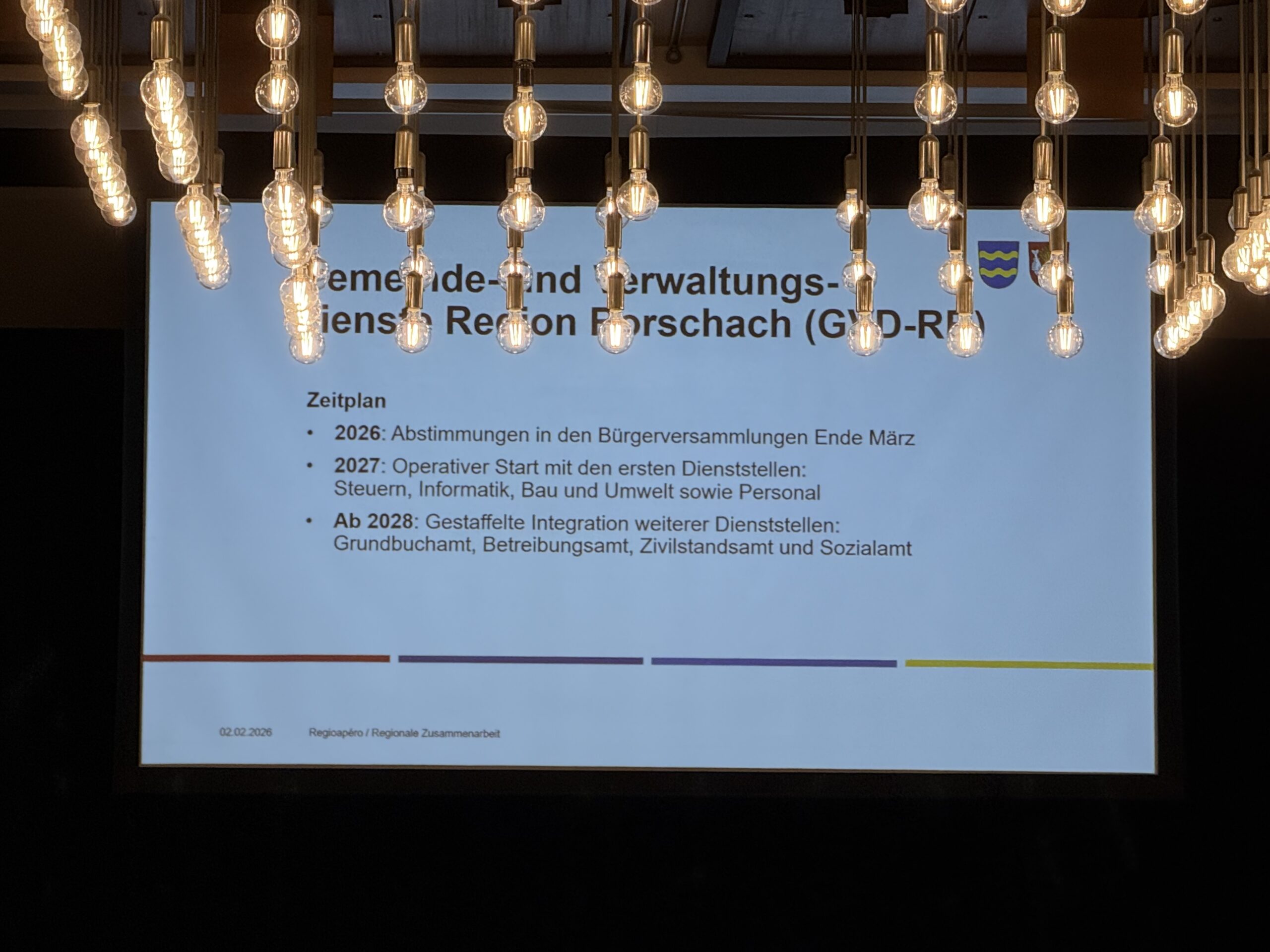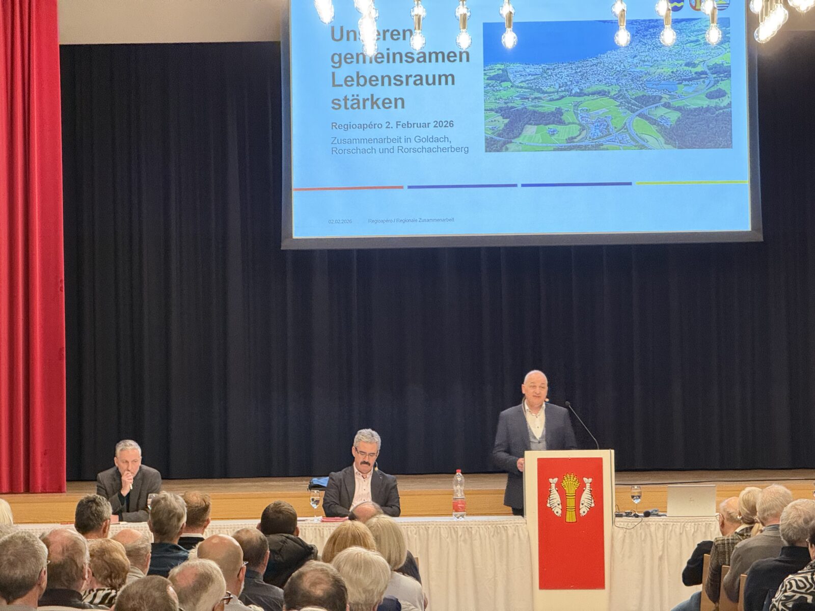 Die ersten Themen des Abends waren die Informatikdienste der Region Rorschach (IDRR), welche durch den Rorschacher Schulratspräsidenten Guido Etterlin vorgestellt wurden. Danach erläuterte der Goldacher Gemeindepräsident Dominik Gemperli die vorgesehene Optimierung der Gemeinde- und Verwaltungsdienste der politischen Gemeinden Goldach und Rorschach, die an den jeweiligen Bürgerversammlungen zur Abstimmung kommen. Weiters wurde auf die Zukunft der regionalen Wasserversorgung sowie der Anergie- und Fernwärmenetze in Goldach und Rorschach eingegangen. Vorgestellt wurde das von Dominik Gemperli (Goldach stimmt darüber am 8. März 2026 ab) und Stadtpräsident Röbi Raths. Er hat dann zum Schluss auch die bevorstehende Abstimmung über die Kantonsstrasse zum See und den dazu gehörenden Autobahnanschluss Plus zum Thema gemacht. Auch hier fällt die Bevölkerung des Kantons St.Gallen am 8. März 2026 die Entscheidung.