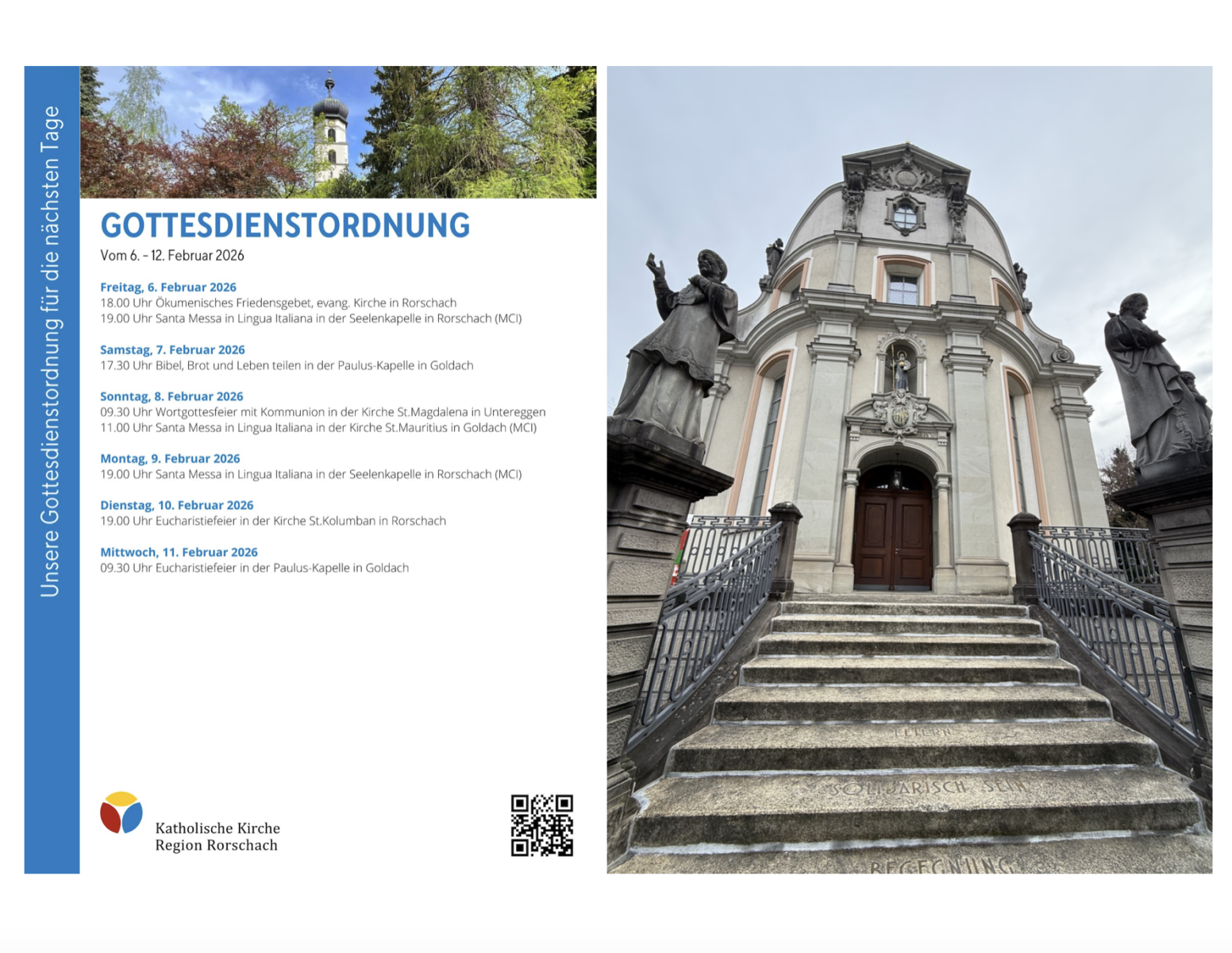 Gottesdienstordnung der KKRR für die nächsten TageThemen:Kath. RorschachKulturPartnerRegionRorschach 6. Februar 2026 - 05:20Gilt ab heute Freitag bis kommenden Mittwoch, 11. Februar 2026. Mehr Informationen finden Interessierte immer auch hier und hier.Teilen mit: Email a link to a friend (Wird in neuem Fenster geöffnet) E-Mail Drucken (Wird in neuem Fenster geöffnet) Drucken Share on Facebook (Wird in neuem Fenster geöffnet) Facebook Share on X (Wird in neuem Fenster geöffnet) X Share on WhatsApp (Wird in neuem Fenster geöffnet) WhatsApp Gefällt mir:Gefällt mir Wird geladen …Newsletter abonnieren Bitte dieses Feld leer lassenBitte wähle, ob Du über jeden neuen Beitrag sofort oder lieber jeden Morgen gegen 9 Uhr eine Zusammenfassung der neusten Beiträge erhalten möchtest.Liste(n) auswählen: Neues vom Echo (Zusammenfassung) Neues vom Echo (Sofortbenachrichtigung) Dieses Feld wird benötigt.Prüfen Sie Ihren Posteingang und den Spamordner, um Ihr Abonnement zu bestätigen.