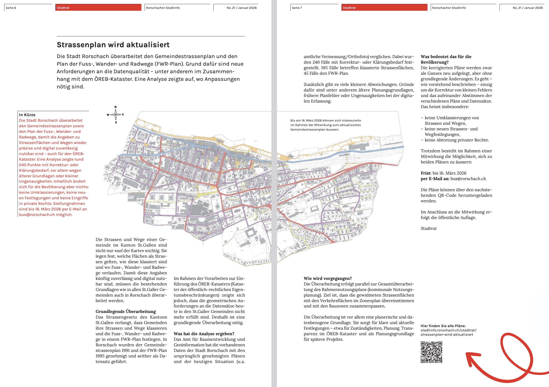 Die Stadt Rorschach überarbeitet den Gemeindestrassenplan sowie den Plan der Fuss-, Wander- und Radwege, damit die Angaben zu Strassenflächen und Wegen wieder präzise und digital zuverlässig nutzbar sind – auch für den ÖREB-Kataster. Eine Analyse zeigte rund 240 Punkte mit Korrektur- oder Klärungsbedarf, vor allem wegen älterer Grundlagen oder kleiner Ungenauigkeiten. Inhaltlich ändert sich für die Bevölkerung aber nichts: keine Umklassierungen, keine neuen Festlegungen und keine Eingriffe in private Rechte. Stellungnahmen sind bis 16. März 2026 per E-Mail an