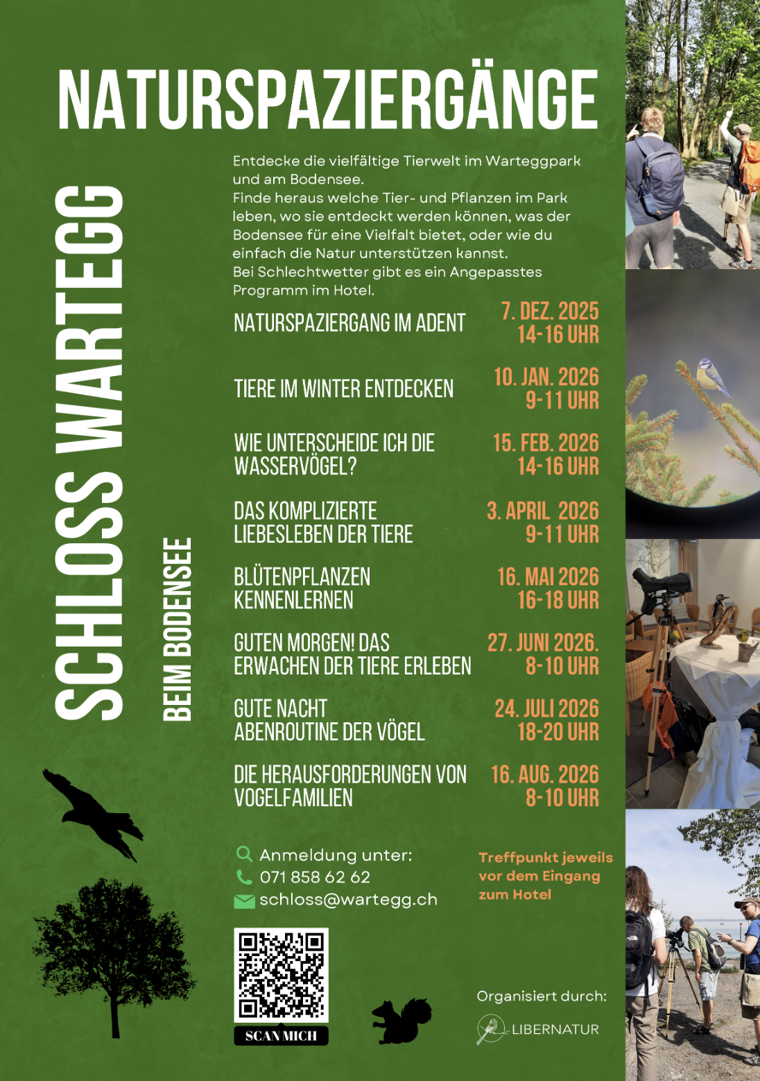 Der diplomierte Feldornithologe und Exkursionsleiter Michel Hänggi begleitet die Teilnehmenden durch den Schlosspark und dem Bodensee entlang und holt die vielmals scheuen und flinken Tiere mit Wissen, Geschichten und Fernrohr näher an alle Interessierten. Next time: Kommenden Sonntag, 15. Februar 2026, zwischen 14 und 16 Uhr. Treffpunkt ist beim Hoteleingang. Kosten: Fr. 15.00.