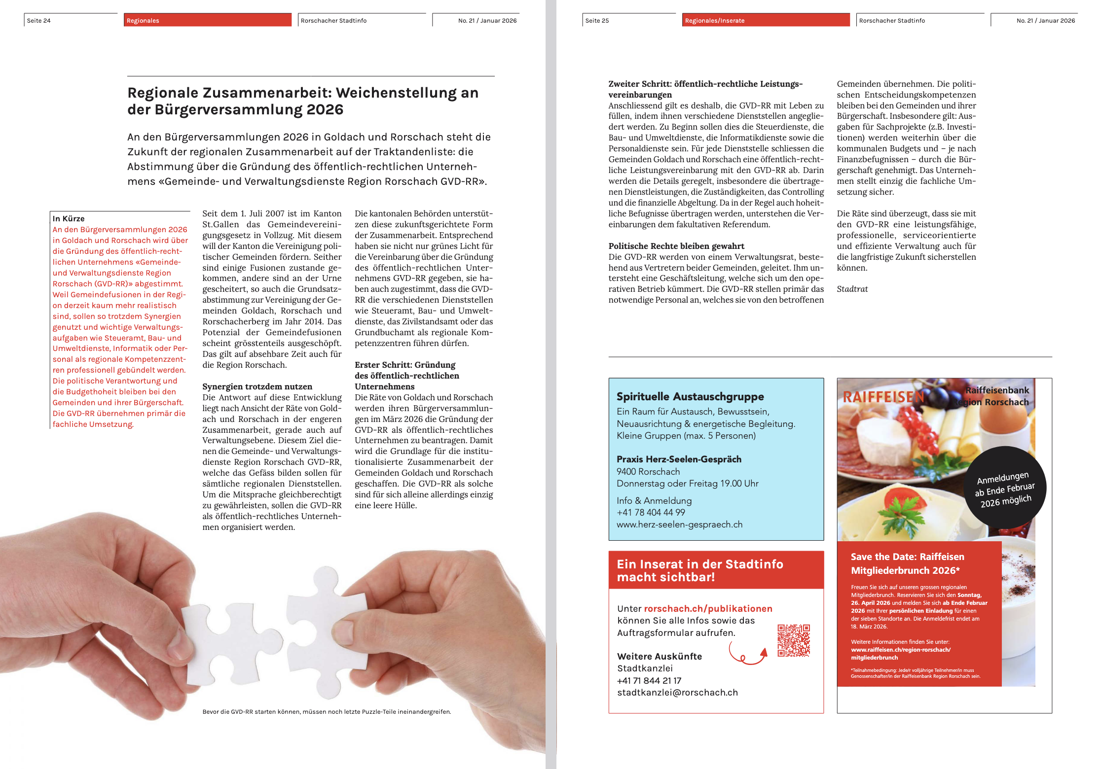 An den Bürgerversammlungen 2026 in Goldach und Rorschach (Dienstag, 31. März 2026) wird über die Gründung des öffentlich-rechtlichen Unternehmens «Gemeinde- und Verwaltungsdienste Region Rorschach (GVD-RR)» abgestimmt. Weil Gemeindefusionen in der Region derzeit kaum mehr realistisch sind, sollen so trotzdem Synergien genutzt und wichtige Verwaltungsaufgaben wie Steueramt, Bau- und Umweltdienste, Informatik oder Personal als regionale Kompetenzzentren professionell gebündelt werden. Die politische Verantwortung und die Budgethoheit bleiben bei den