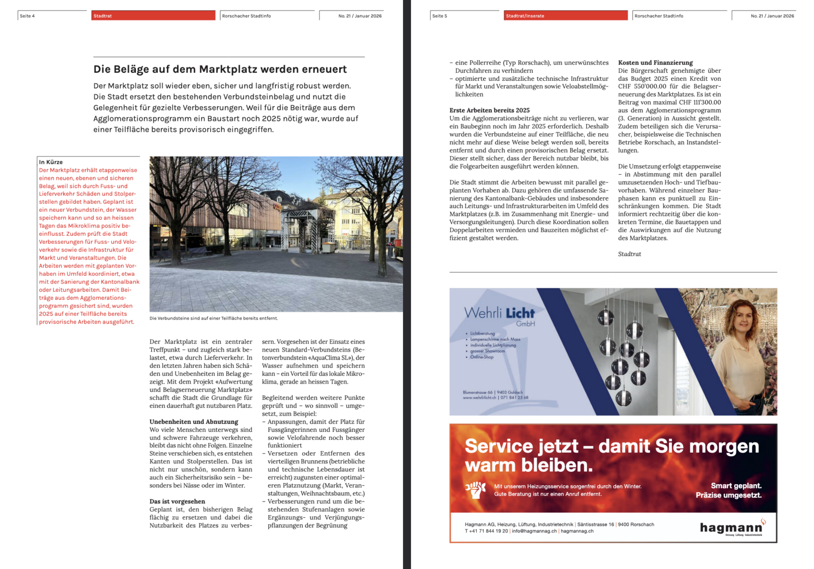 Der Marktplatz erhält etappenweise einen neuen, ebenen und sicheren Belag, weil sich durch Fuss- und Lieferverkehr Schäden und Stolperstellen gebildet haben. Geplant ist ein neuer Verbundstein, der Wasser speichern kann und so an heissen Tagen das Mikroklima positiv beeinflusst. Zudem prüft die Stadt Verbesserungen für Fuss- und Veloverkehr sowie die Infrastruktur für Markt und Veranstaltungen. Die Arbeiten werden mit geplanten Vorhaben im Umfeld koordiniert, etwa mit der Sanierung der Kantonalbank oder Leitungsarbeiten. Damit Beiträge aus dem Agglomerationsprogramm gesichert sind, wurden 2025 auf einer Teilfläche bereits provisorische Arbeiten ausgeführt. Den ganzen Artikel findet man in den letzte Woche verteilten Rorschacher Stadtinfos (Seiten 4 und 5), sowie online hier.