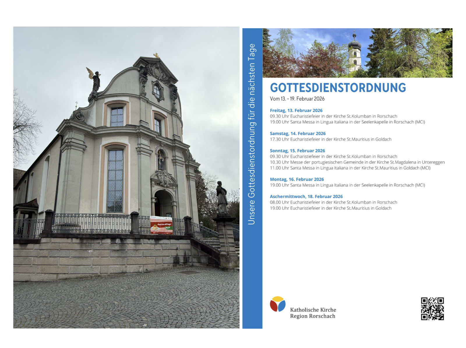 Gottesdienstordnung der KKRR für die nächsten TageThemen:Kath. RorschachKulturPartnerRegionRorschach 13. Februar 2026 - 05:15Gilt ab heute Freitag bis Aschermittwoch, 18. Februar 2026. Mehr Informationen finden Interessierte immer auch hier und hier.Teilen mit: Einen Link per E-Mail an einen Freund senden (Wird in neuem Fenster geöffnet) E-Mail Drucken (Wird in neuem Fenster geöffnet) Drucken Auf Facebook teilen (Wird in neuem Fenster geöffnet) Facebook Auf X teilen (Wird in neuem Fenster geöffnet) X Auf WhatsApp teilen (Wird in neuem Fenster geöffnet) WhatsApp Gefällt mir:Gefällt mir Wird geladen …Newsletter abonnieren Bitte dieses Feld leer lassenBitte wähle, ob Du über jeden neuen Beitrag sofort oder lieber jeden Morgen gegen 9 Uhr eine Zusammenfassung der neusten Beiträge erhalten möchtest.Liste(n) auswählen: Neues vom Echo (Zusammenfassung) Neues vom Echo (Sofortbenachrichtigung) Dieses Feld wird benötigt.Prüfen Sie Ihren Posteingang und den Spamordner, um Ihr Abonnement zu bestätigen.
