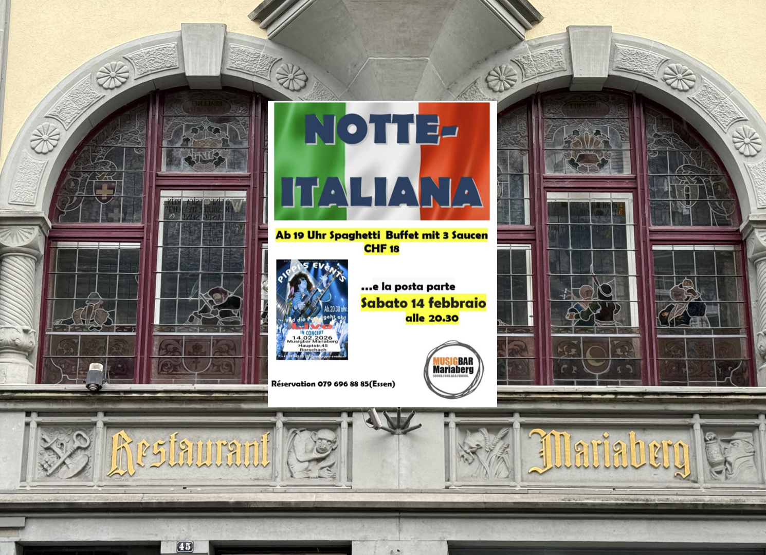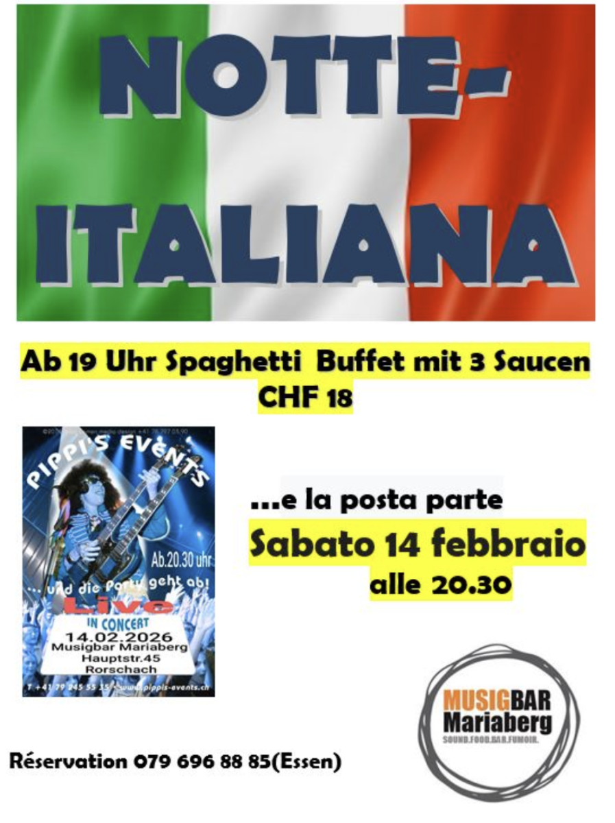 Bei so viel italienischem Charme wird am Samstagabend zum Valentinstag natürlich auch das Essen dem Ambiente angepasst… Mehr zur Musigbar Mariaberg findet man hier, mehr zu Pippi da. (Plakat: pd mbmb)