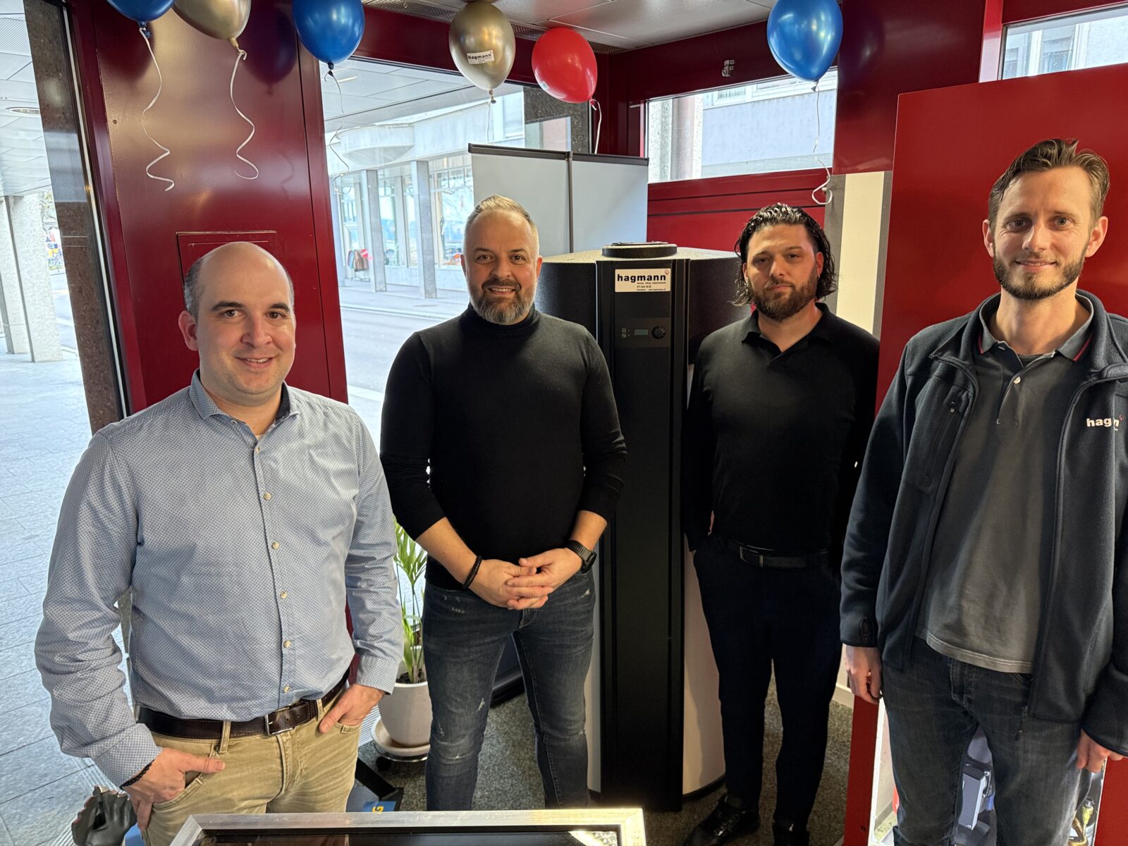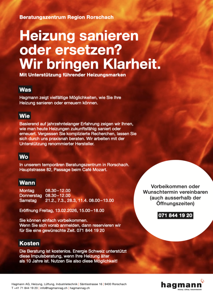 Der Rorschacher Fachbetrieb Hagmann AG ist spezialisiert auf Planung, Realisation & Unterhalt von Heizungs-, Lüftungs-, Klima-, Kälte- und Industrieanlagen und die Umsetzung von Neubau- und Sanierungsprojekten in Wohnhäuser, Geschäfts- und Industriegebäuden. Für einige Tage bringen sie ihr wertvolles Knowhow von der Säntisstrasse 16 an die Hauptstrasse 82 (Passage beim Hotel Mozart). Gestern fand ein kleine Eröffnung statt und in den nächsten Tagen wird das Team um Stefan Halbherr bei Fragen rund um Heizungssysteme unkompliziert mitten in der Stadt beraten. Details findet man auf dem Flyer oben. Next time: Kommenden Montag, 16. Februar 2026, von 08.30 bis 12.00 Uhr. Hier Fotos von gestern Nachmittag. Das Beitragsbild zeigt von links die Geschäftsleitunsmitglieder Stefan Halbheer, Goran Bulatovic, Antonio Chiarello und Jan Rechsteiner.
