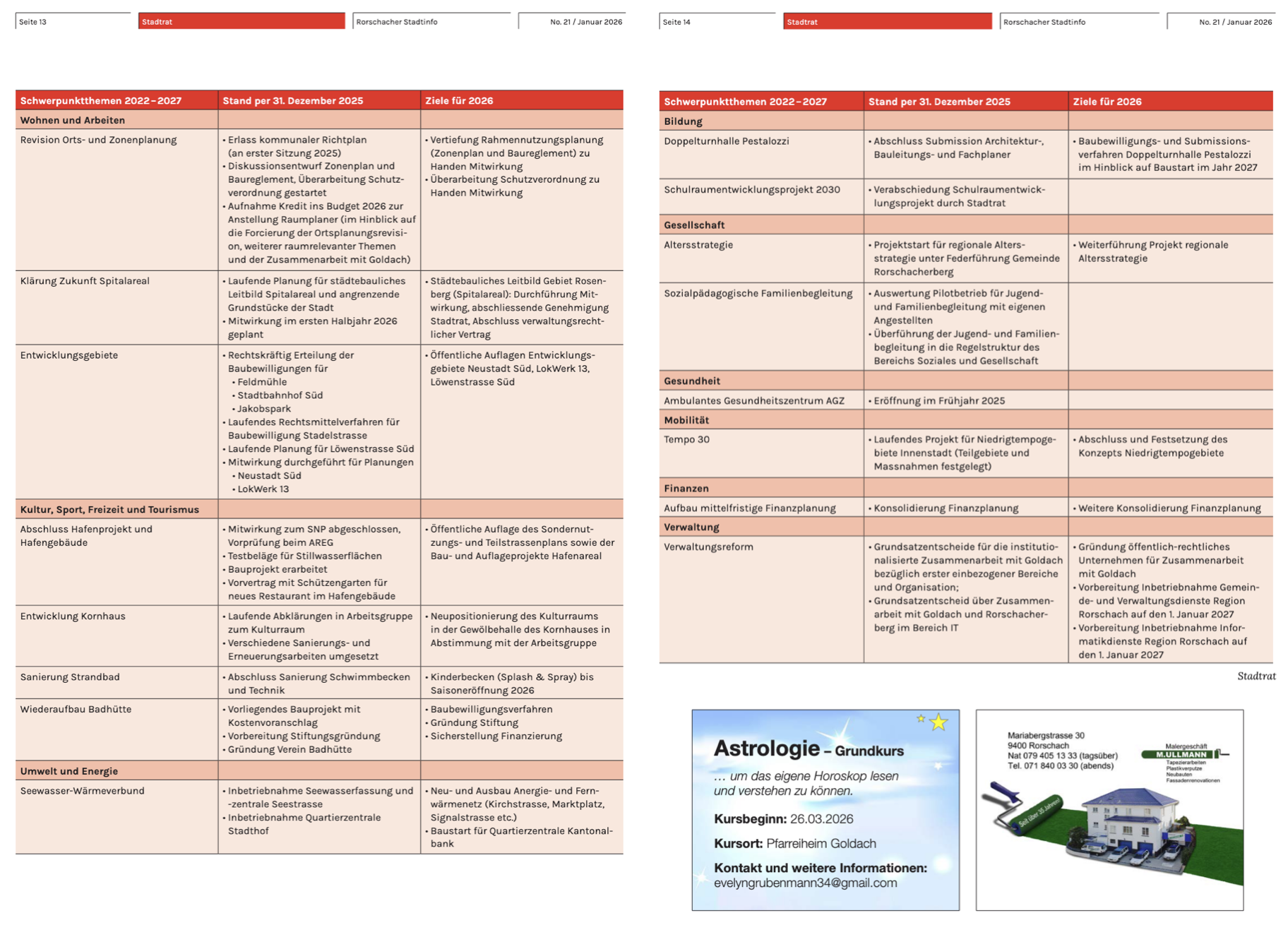 Auch in Freizeit und Bildung geht es weiter, etwa mit dem Kinderbereich im Strandbad oder den nächsten Schritten für die Doppelturnhalle Pestalozzi. Auch der Ausbau des Seewasser-Wärmeverbunds bleibt ein Schwerpunkt. Ein Ausblick also, der zeigt: 2026 wird für Rorschach ein Jahr, in dem viel in Bewegung kommt.