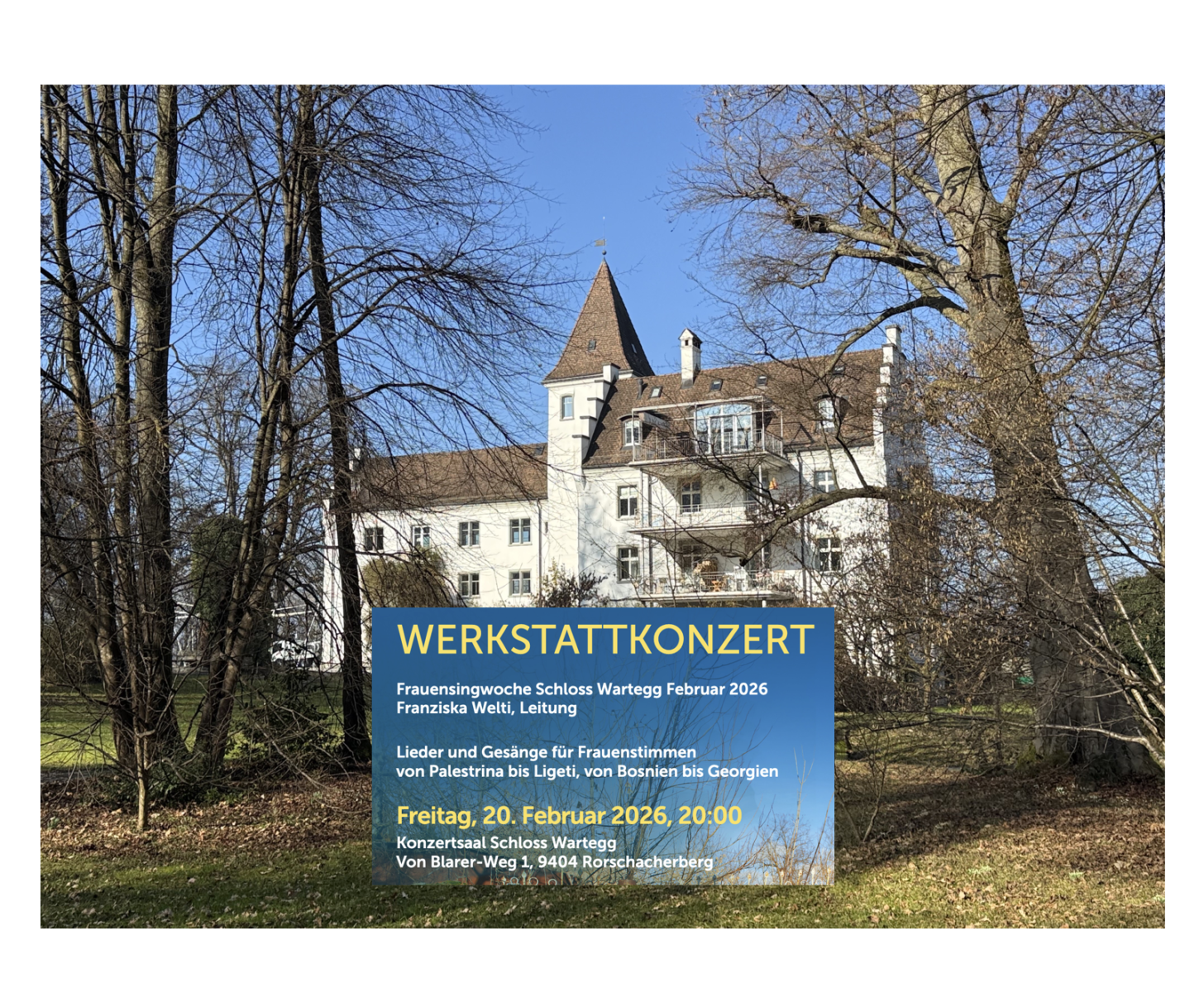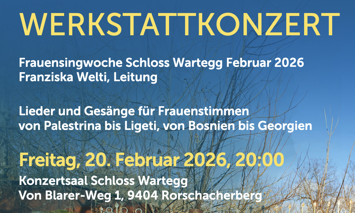 24 Frauen aus nah und fern singen unter der Leitung der Sängerin und Chorleiterin Franziska Welti eine Woche gemeinsam zusammen. Morgen Freitag, 20. Februar, um 20.00 präsentieren sie das Programm in einem Werkstattkonzert im Schloss Wartegg. Es erklingen Werke von Casanova, Ferreira, Ligeti, Mendelssohn, Monney, Monteverdi, Palestrina, Gesänge aus Bosnien, Brasilien, Georgien, der Schweiz und der Ukraine.