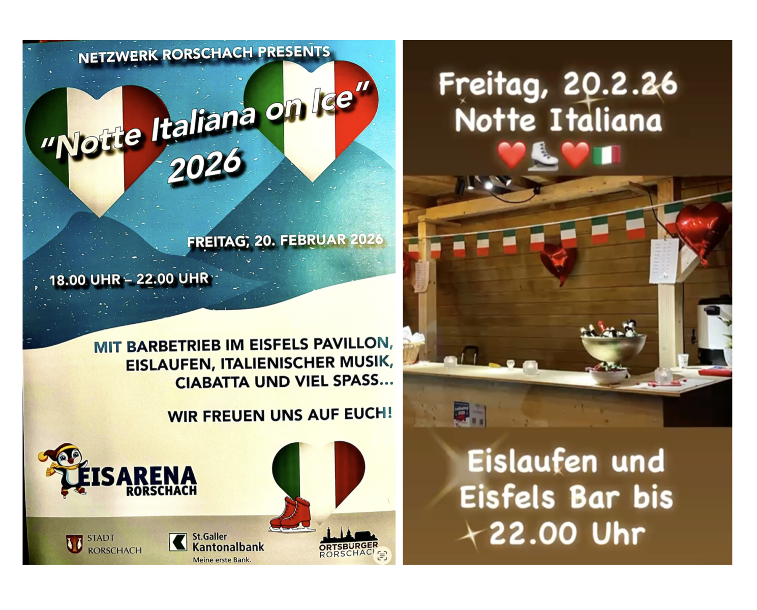 Eisdisco zum Start ins letzte Eisarena-WochenendeThemen:Eisarena 2026KulturRorschach 20. Februar 2026 - 05:25Heute ab 18 Uhr auf der Eisfläche. Und ausnahmsweise bis 22 Uhr!! Bereits im Verlauf des Nachmittags steht Moni Thoma am Tresen der Eisfels-Bar.Teilen mit: Einen Link per E-Mail an einen Freund senden (Wird in neuem Fenster geöffnet) E-Mail Drucken (Wird in neuem Fenster geöffnet) Drucken Auf Facebook teilen (Wird in neuem Fenster geöffnet) Facebook Auf X teilen (Wird in neuem Fenster geöffnet) X Auf WhatsApp teilen (Wird in neuem Fenster geöffnet) WhatsApp Gefällt mir:Gefällt mir Wird geladen …Newsletter abonnieren Bitte dieses Feld leer lassenBitte wähle, ob Du über jeden neuen Beitrag sofort oder lieber jeden Morgen gegen 9 Uhr eine Zusammenfassung der neusten Beiträge erhalten möchtest.Liste(n) auswählen: Neues vom Echo (Zusammenfassung) Neues vom Echo (Sofortbenachrichtigung) Dieses Feld wird benötigt.Prüfen Sie Ihren Posteingang und den Spamordner, um Ihr Abonnement zu bestätigen.