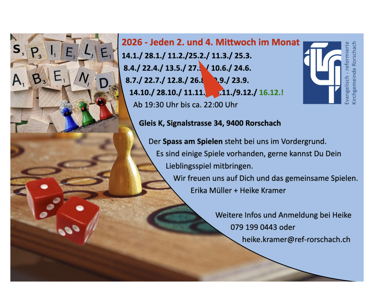 Diese Spieleabende finden jeden 2. und 4. Mittwoch im Monat von 19.30 bis 22 Uhr im Haus Gleis K an der Signalstrasse 34 in Rorschach statt. Heike Kramer und Erika Müller schreiben dazu: „Der Spass am Spielen steht bei uns im Vordergrund. Es sind einige Spiele vorhanden, gerne kannst Du Dein Lieblingsspiel mitbringen. Wir freuen uns auf Dich und das gemeinsame Spielen.“ Für weitere Auskünfte kann man sich direkt an Heike Kramer wenden.