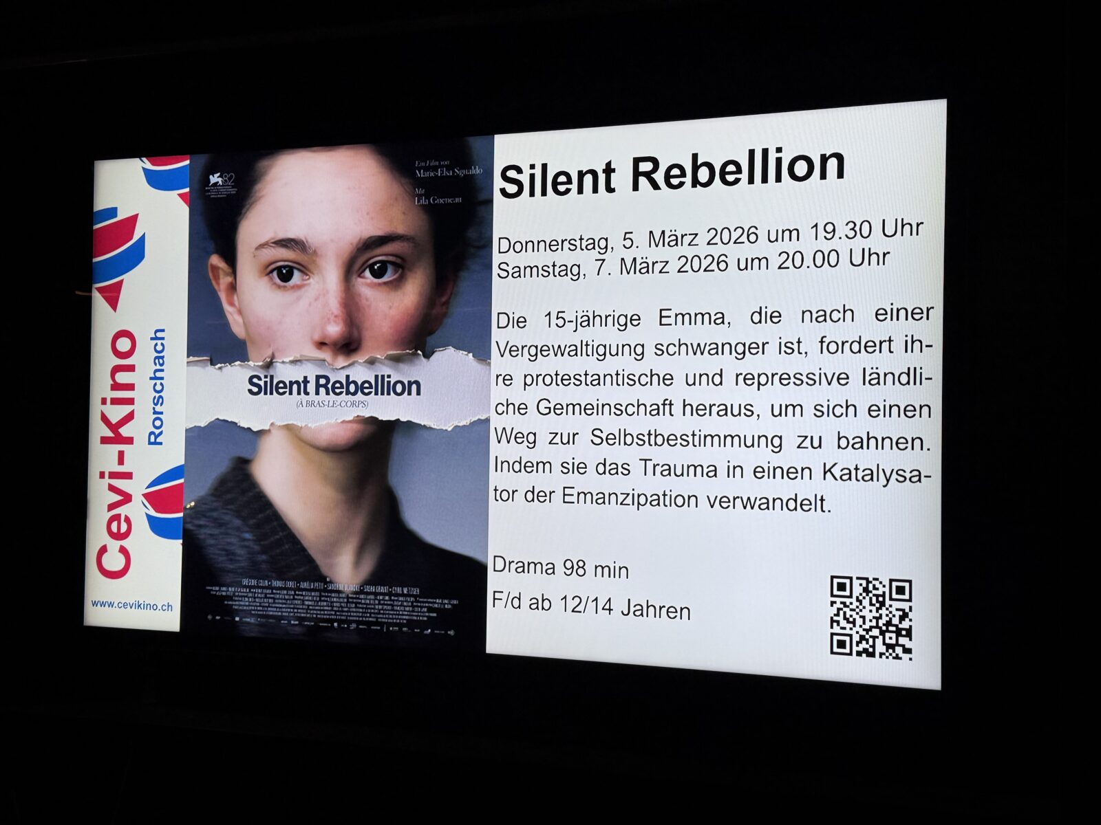 Heute Donnerstag, 05.03.2026, von 19.30 bis 21.30 Uhr im EKZ – Evang. Kirchgemeindezentrum. Zum Inhalt: „Die 15-jährige Emma, die nach einer Vergewaltigung schwanger ist, fordert ihre protestantische und repressive ländliche Gemeinschaft heraus, um sich einen Weg zur Selbstbestimmung zu bahnen. Indem sie das Trauma in einen Katalysator der Emanzipation verwandelt, stellt sie sich der moralischen Heuchelei des Dorfes und dem Gespenst des Zweiten Weltkriegs, das sie umgibt.“ Mehr zum Programm (inkl. Trailer) der nächsten 4 Tage findet man auch hier.