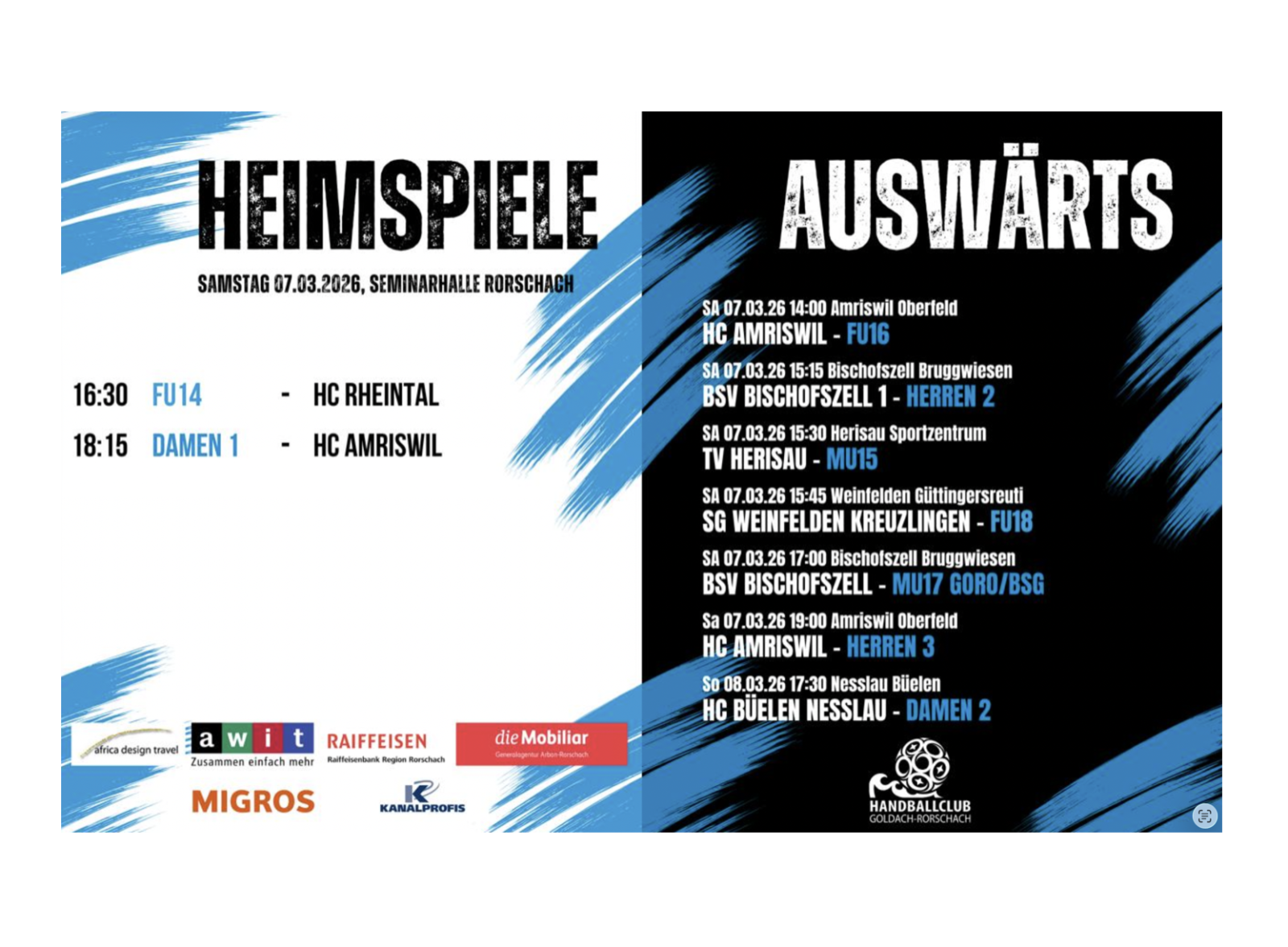 9 HC GoRo-Teams im Einsatz, 2 heute in der SemihalleThemen:HC GoRo 7. März 2026 - 05:00In der Rorschacher Semihalle spielen heute das FU14-Team (16:30 Uhr) und das Damen 1 (18:15 Uhr)Teilen mit: Einen Link per E-Mail an einen Freund senden (Wird in neuem Fenster geöffnet) E-Mail Drucken (Wird in neuem Fenster geöffnet) Drucken Auf Facebook teilen (Wird in neuem Fenster geöffnet) Facebook Auf X teilen (Wird in neuem Fenster geöffnet) X Auf WhatsApp teilen (Wird in neuem Fenster geöffnet) WhatsApp Gefällt mir:Gefällt mir Wird geladen …Newsletter abonnieren Bitte dieses Feld leer lassenBitte wähle, ob Du über jeden neuen Beitrag sofort oder lieber jeden Morgen gegen 9 Uhr eine Zusammenfassung der neusten Beiträge erhalten möchtest.Liste(n) auswählen: Neues vom Echo (Zusammenfassung) Neues vom Echo (Sofortbenachrichtigung) Dieses Feld wird benötigt.Prüfen Sie Ihren Posteingang und den Spamordner, um Ihr Abonnement zu bestätigen.