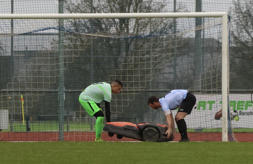 Kurz nach dem Anpfiff schlich sich ein zweiter Torwart bis auf die Goal-Linie zu Jordi Forster. Elektro-Rasenmäher «Robi» wollte die Einheimischen unterstützen, wurde aber innert Kürze von Captain Patrice Baumann und Goali Jordi Forster wieder (unverletzt) vom Platz getragen…