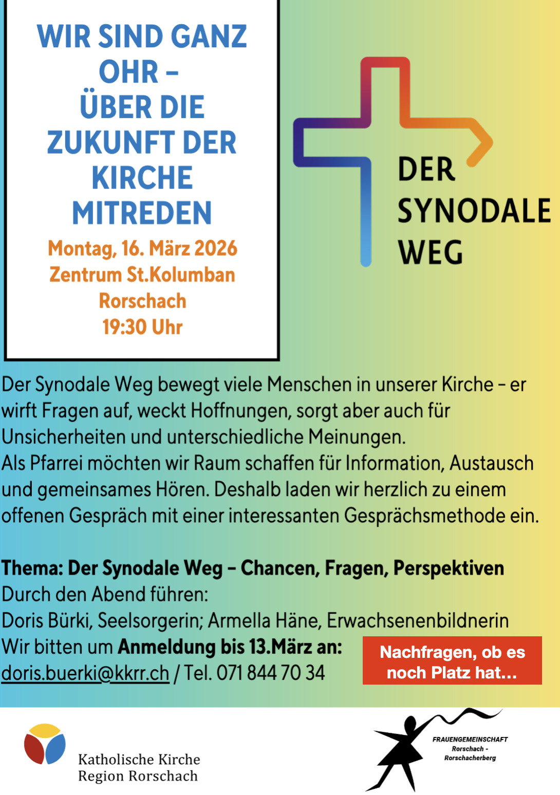 Die Organisatorinnen schreiben dazu: „Der Synodale Weg bewegt viele Menschen in unserer Kirche – er wirft Fragen auf, weckt Hoffnungen, sorgt aber auch für Unsicherheiten und unterschiedliche Meinungen. Als Pfarrei möchten wir Raum schaffen für Information, Austausch und gemeinsames Hören. Deshalb laden wir herzlich zu einem offenen Gespräch mit einer interessanten Gesprächsmethode ein. Durch den Abend führen: Doris Bürki, Seelsorgerin; Armella Häne, Erwachsenenbildnerin. Auskunft: doris.buerki@kkrr.ch / Tel. 071 844 70 34.
