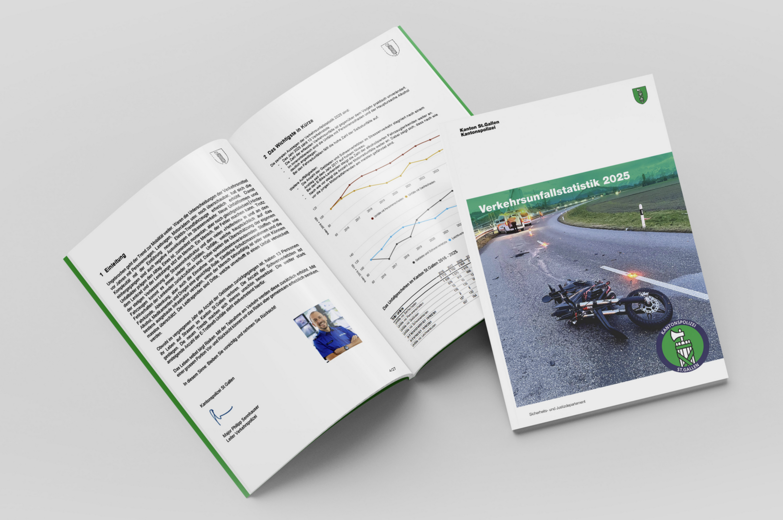 Der Leiter der Verkehrspolizei der Kantonspolizei St.Gallen, Philipp Sennhauser, fasst die Entwicklungen der Verkehrsunfallstatistik wie folgt zusammen: «Eines ist – zumindest momentan – auch gegenüber früher gleichgeblieben. Hinter dem Lenkrad und der Lenkstange sitzt ein Mensch. Ein Mensch, der Fehler macht. Trotz der stetigen Verbesserung der Strasseninfrastruktur und den viel «Helferlein» in und an den Fahrzeugen kommt es immer wieder zu Unfällen. Unfälle, welche hauptsächlich auf das Fehlverhalten der Lenkenden zurückzuführen sind. Dabei spielen Überschätzung der eigenen Fahrkünste, Ablenkung aber auch die Einnahme von bewusstseinsverändernden Stoffen wie Alkohol, Medikamenten und Drogen eine gewichtige Rolle.»