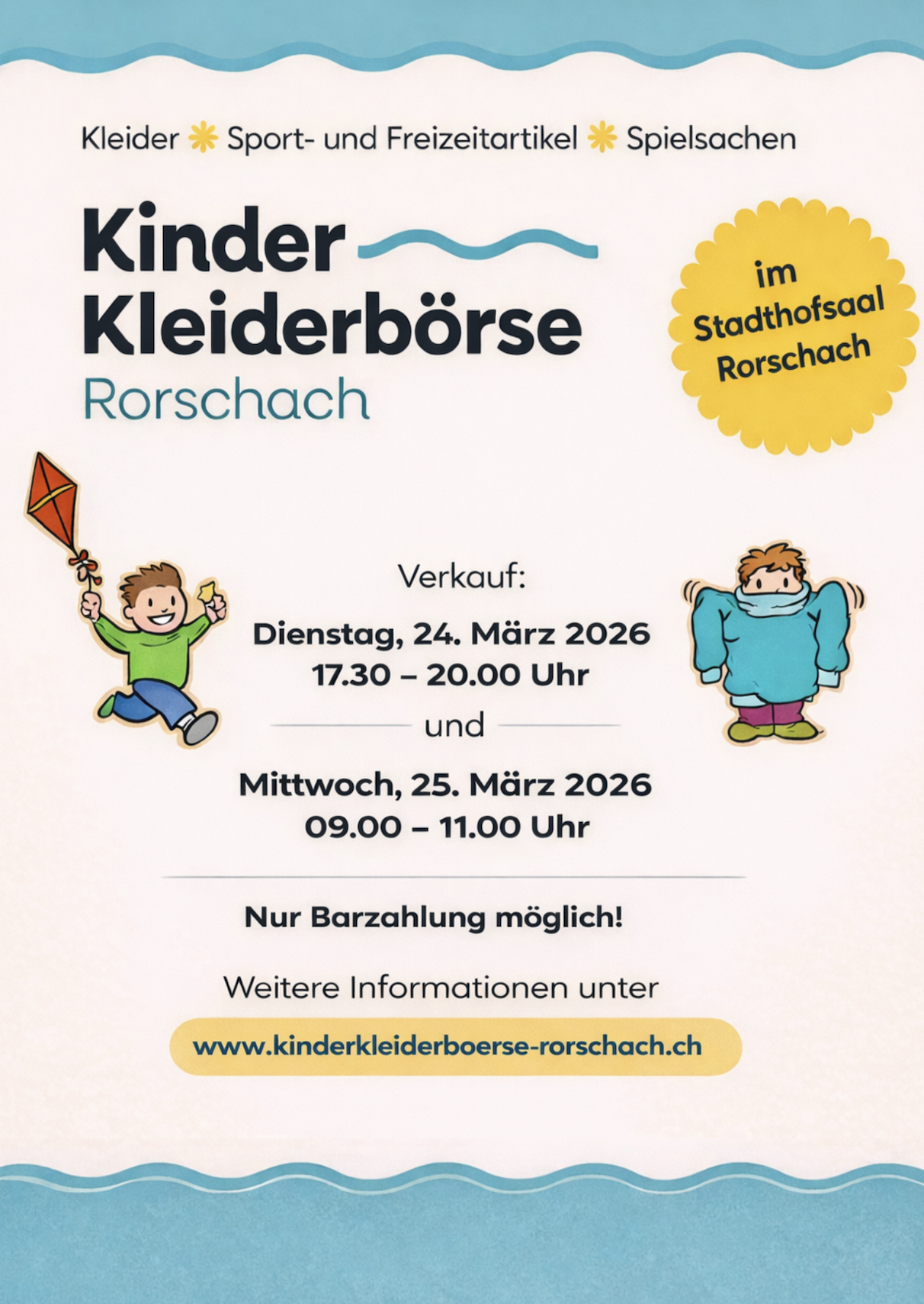 Heute & morgen ist wieder Kinderkleiderbörse angesagtThemen:KulturRorschach 24. März 2026 - 05:37Die wichtigsten Details findet man auf dem Flyer unten und online hier.Teilen mit: Einen Link per E-Mail an einen Freund senden (Wird in neuem Fenster geöffnet) E-Mail Drucken (Wird in neuem Fenster geöffnet) Drucken Auf Facebook teilen (Wird in neuem Fenster geöffnet) Facebook Auf X teilen (Wird in neuem Fenster geöffnet) X Auf WhatsApp teilen (Wird in neuem Fenster geöffnet) WhatsApp Gefällt mir:Gefällt mir Wird geladen …Newsletter abonnieren Bitte dieses Feld leer lassenBitte wähle, ob Du über jeden neuen Beitrag sofort oder lieber jeden Morgen gegen 9 Uhr eine Zusammenfassung der neusten Beiträge erhalten möchtest.Liste(n) auswählen: Neues vom Echo (Zusammenfassung) Neues vom Echo (Sofortbenachrichtigung) Dieses Feld wird benötigt.Prüfen Sie Ihren Posteingang und den Spamordner, um Ihr Abonnement zu bestätigen.