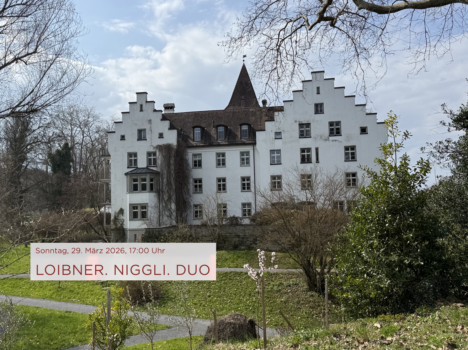 Loibner Niggli Duo: „Still storm“ im Schloss WarteggThemen:KulturPartnerRorschacherbergSchloss Wartegg 25. März 2026 - 05:10Foto: pd zVgUnd zwar kommenden Sonntag, 29. März 2026, um 17 Uhr. Mehr Infos rund um dieses Konzert findet man hier.Das nächste Highlight rund um das Schloss Wartegg ist schon in der Pipeline…Teilen mit: Einen Link per E-Mail an einen Freund senden (Wird in neuem Fenster geöffnet) E-Mail Drucken (Wird in neuem Fenster geöffnet) Drucken Auf Facebook teilen (Wird in neuem Fenster geöffnet) Facebook Auf X teilen (Wird in neuem Fenster geöffnet) X Auf WhatsApp teilen (Wird in neuem Fenster geöffnet) WhatsApp Gefällt mir:Gefällt mir Wird geladen …Newsletter abonnieren Bitte dieses Feld leer lassenBitte wähle, ob Du über jeden neuen Beitrag sofort oder lieber jeden Morgen gegen 9 Uhr eine Zusammenfassung der neusten Beiträge erhalten möchtest.Liste(n) auswählen: Neues vom Echo (Zusammenfassung) Neues vom Echo (Sofortbenachrichtigung) Dieses Feld wird benötigt.Prüfen Sie Ihren Posteingang und den Spamordner, um Ihr Abonnement zu bestätigen.