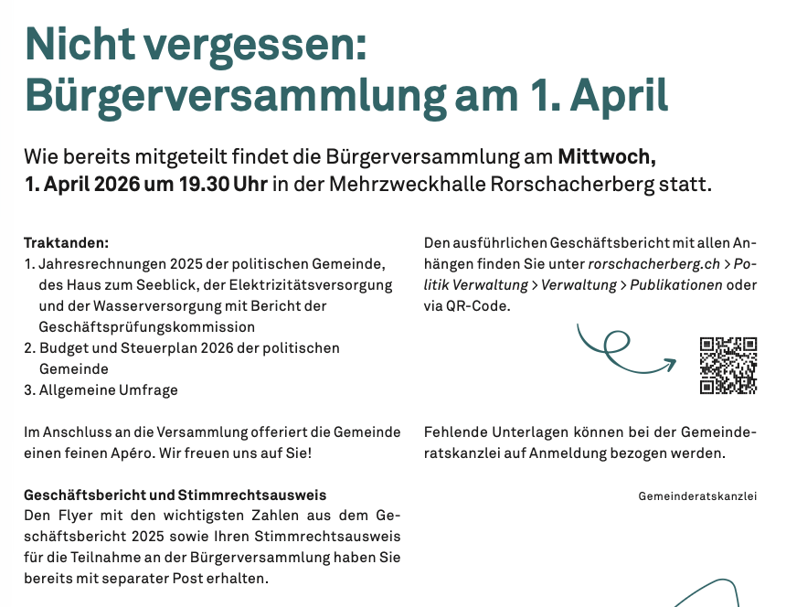 In Rorschacherberg wird der neue Rundblick verteiltThemen:Rorschacherberg 27. März 2026 - 10:01Ab heute in den vielen Briefkästen der Gemeinde und demnächst online auch hier. Die Bürgerversammlung findet kommenden Mittwoch in der Mehrzweckhalle Rorschacherberg statt. Den Geschäftsbericht finden Interessierte hier.Teilen mit: Einen Link per E-Mail an einen Freund senden (Wird in neuem Fenster geöffnet) E-Mail Drucken (Wird in neuem Fenster geöffnet) Drucken Auf Facebook teilen (Wird in neuem Fenster geöffnet) Facebook Auf X teilen (Wird in neuem Fenster geöffnet) X Auf WhatsApp teilen (Wird in neuem Fenster geöffnet) WhatsApp Gefällt mir:Gefällt mir Wird geladen …Newsletter abonnieren Bitte dieses Feld leer lassenBitte wähle, ob Du über jeden neuen Beitrag sofort oder lieber jeden Morgen gegen 9 Uhr eine Zusammenfassung der neusten Beiträge erhalten möchtest.Liste(n) auswählen: Neues vom Echo (Zusammenfassung) Neues vom Echo (Sofortbenachrichtigung) Dieses Feld wird benötigt.Prüfen Sie Ihren Posteingang und den Spamordner, um Ihr Abonnement zu bestätigen.