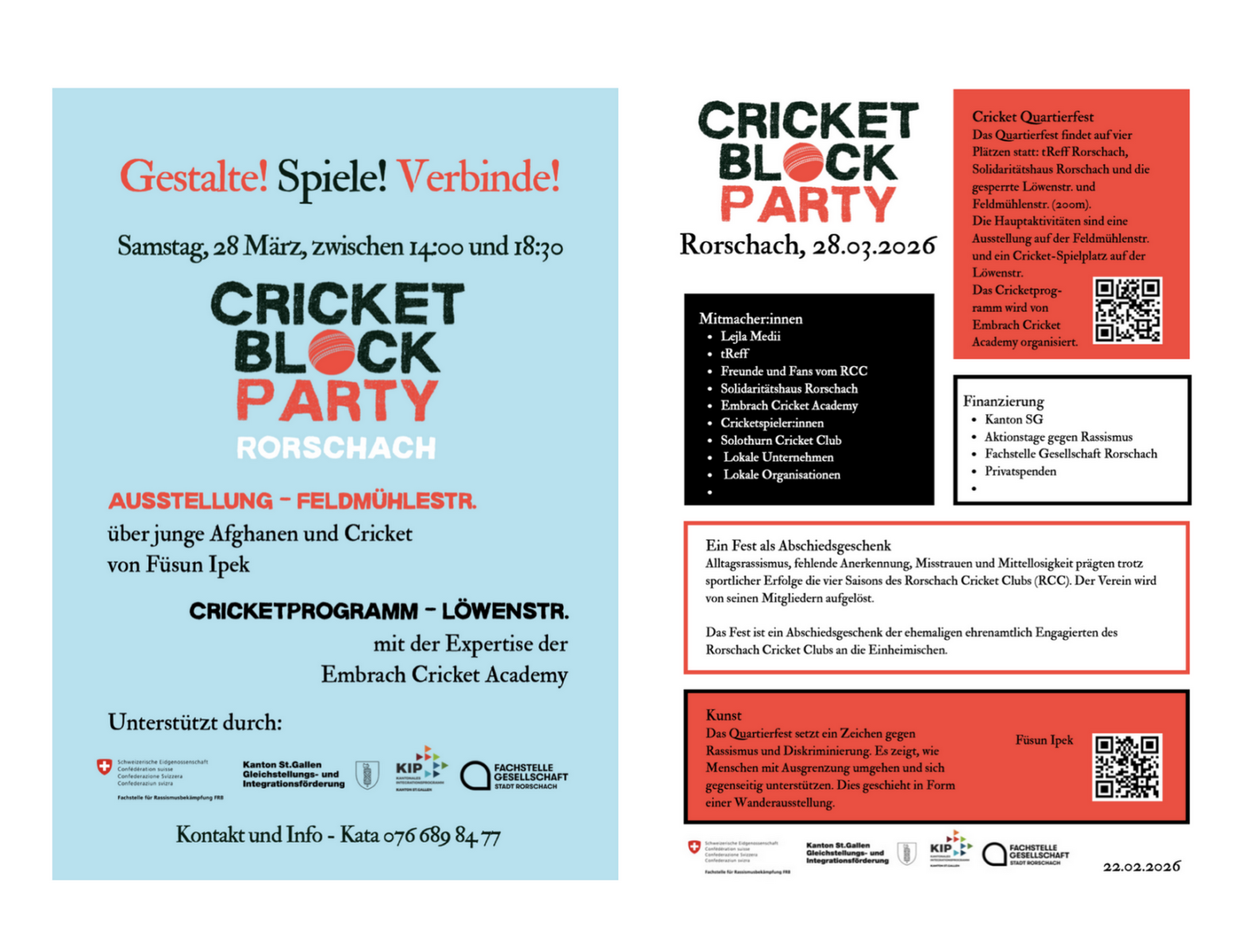 Für weitere Infos stehen Kata Piroch, Projektleiterin und Kamran Sherzad, Mediensprecher zur Verfügung. >> kata@cricket-block-party.org und 076 689 84 77.