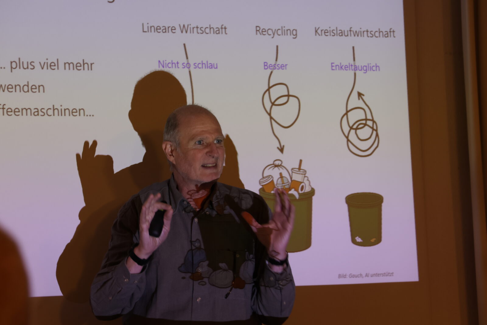 Nach den statutarischen Pflichtteilen stand der Vortrag von Marcel Gauch zur Kreislaufwirtschaft im Zentrum des Interesses. Manchmal könne es hilfreich sein, ein paar Schritte zurückzustehen und komplexere Themen aus Distanz zu betrachten. Nach diesem Motto zeigte Marcel Gauch, Nachhaltigkeitsforscher an der Empa St.Gallen, einige grundsätzliche Gedanken zum Umgang mit Materialien und Energie auf. Die Anwesenden wurden dazu inspiriert, gemeinsam in Richtung einer enkeltauglichen Zukunft voranzuschreiten. Ein Vortrag, der auch unter die Haut ging. Hier einige Impressionen daraus heraus: