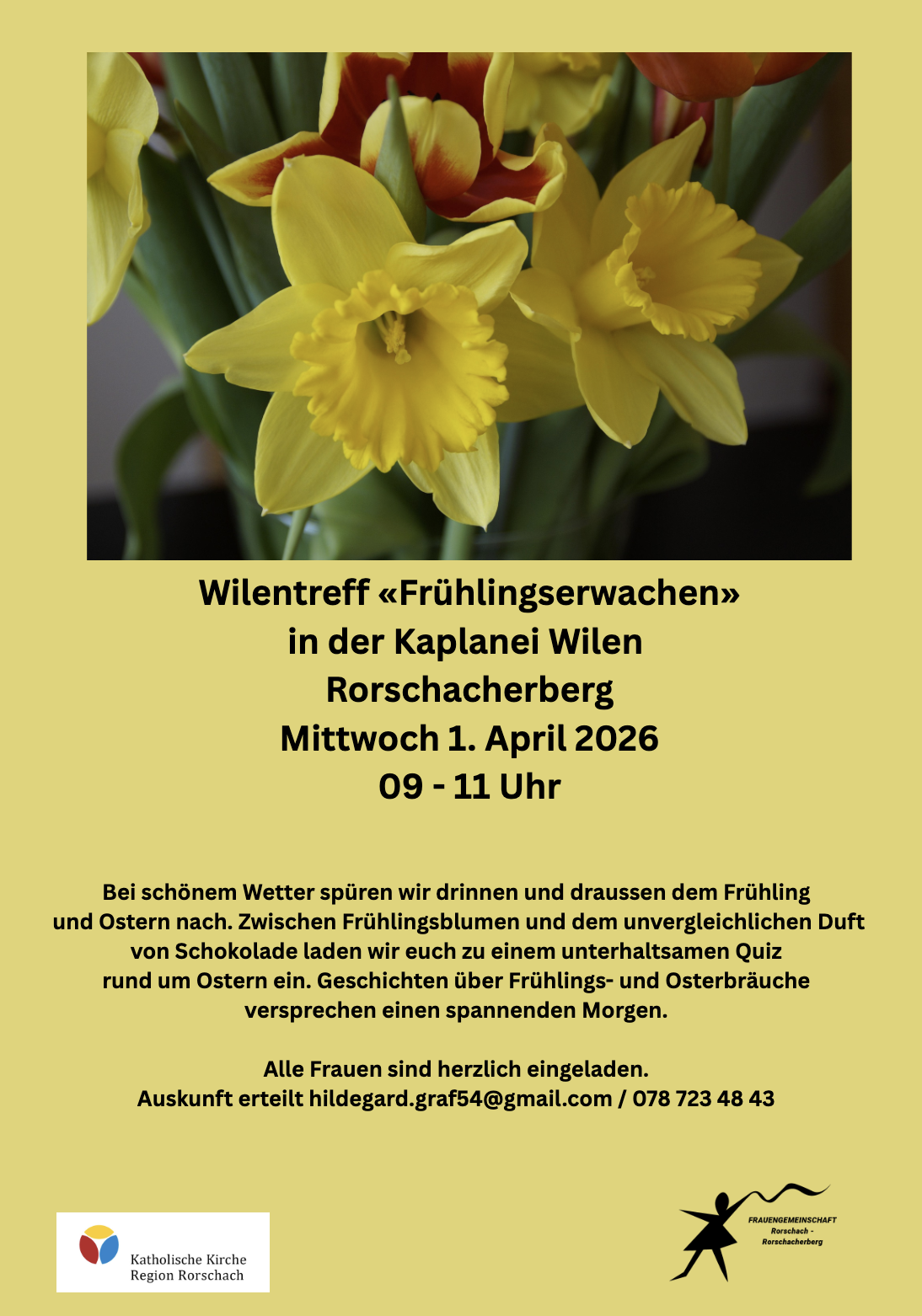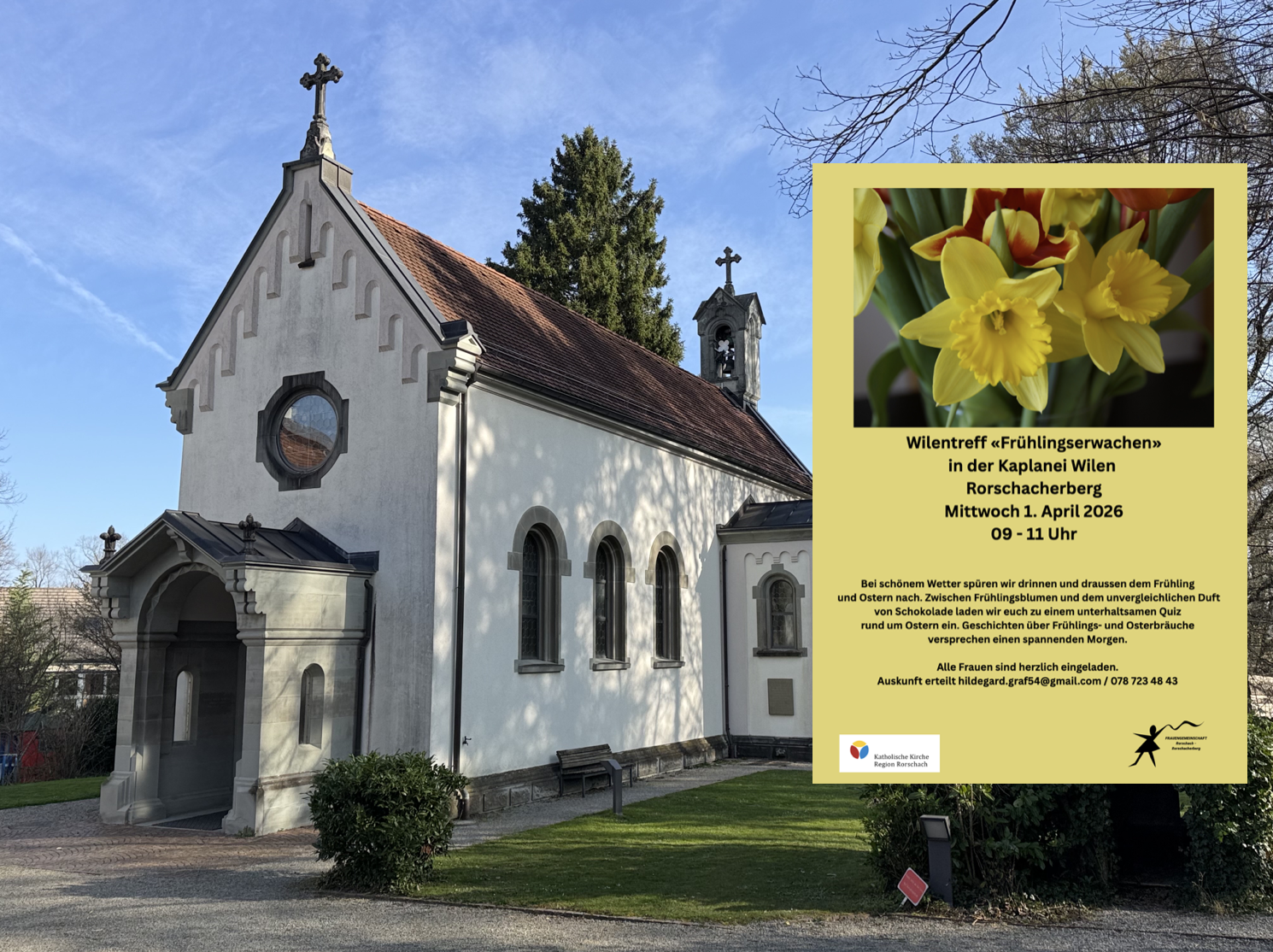 Frauengemeinschaft trifft sich in der Kaplanei WilenThemen:Kath. RorschachKulturPartnerRorschachRorschacherberg 31. März 2026 - 05:10Dieses Treffen der Frauengemeinschaft Rorschach – Rorschacherberg findet morgen Mittwoch statt. Details finden interessierte Frauen auf dem Flyer unten.Teilen mit: Einen Link per E-Mail an einen Freund senden (Wird in neuem Fenster geöffnet) E-Mail Drucken (Wird in neuem Fenster geöffnet) Drucken Auf Facebook teilen (Wird in neuem Fenster geöffnet) Facebook Auf X teilen (Wird in neuem Fenster geöffnet) X Auf WhatsApp teilen (Wird in neuem Fenster geöffnet) WhatsApp Gefällt mir:Gefällt mir Wird geladen …Newsletter abonnieren Bitte dieses Feld leer lassenBitte wähle, ob Du über jeden neuen Beitrag sofort oder lieber jeden Morgen gegen 9 Uhr eine Zusammenfassung der neusten Beiträge erhalten möchtest.Liste(n) auswählen: Neues vom Echo (Zusammenfassung) Neues vom Echo (Sofortbenachrichtigung) Dieses Feld wird benötigt.Prüfen Sie Ihren Posteingang und den Spamordner, um Ihr Abonnement zu bestätigen.