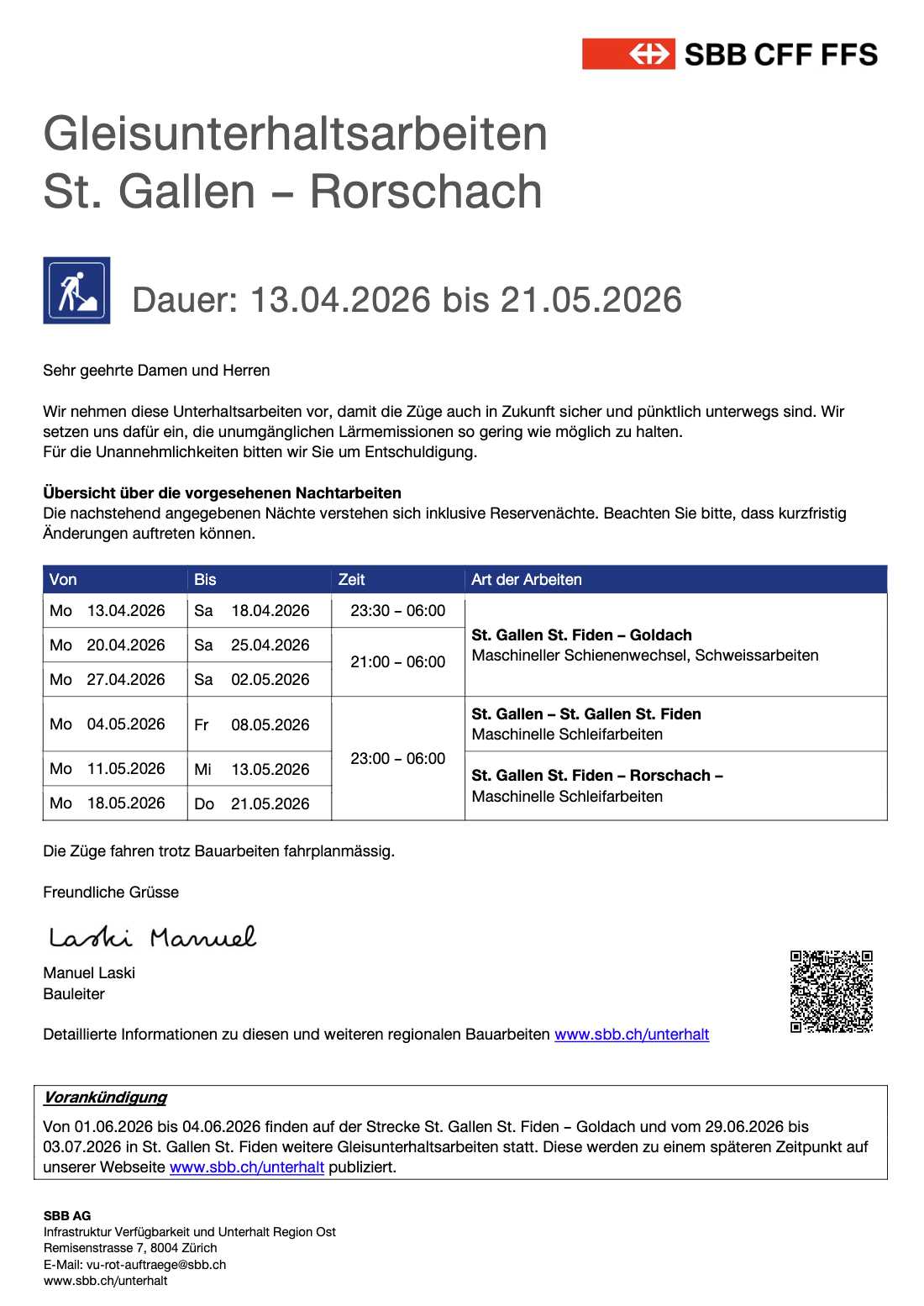 Die Züge verkehren trotz Bauarbeiten planmässigThemen:Region 7. April 2026 - 05:20Alle relevanten Informationen findet man auf dem Flyer der SBB. (Flyer/Planskizze: pd sbb)Teilen mit: Einen Link per E-Mail an einen Freund senden (Wird in neuem Fenster geöffnet) E-Mail Drucken (Wird in neuem Fenster geöffnet) Drucken Auf Facebook teilen (Wird in neuem Fenster geöffnet) Facebook Auf X teilen (Wird in neuem Fenster geöffnet) X Auf WhatsApp teilen (Wird in neuem Fenster geöffnet) WhatsApp Gefällt mir:Gefällt mir Wird geladen …Newsletter abonnieren Bitte dieses Feld leer lassenBitte wähle, ob Du über jeden neuen Beitrag sofort oder lieber jeden Morgen gegen 9 Uhr eine Zusammenfassung der neusten Beiträge erhalten möchtest.Liste(n) auswählen: Neues vom Echo (Zusammenfassung) Neues vom Echo (Sofortbenachrichtigung) Dieses Feld wird benötigt.Prüfen Sie Ihren Posteingang und den Spamordner, um Ihr Abonnement zu bestätigen.