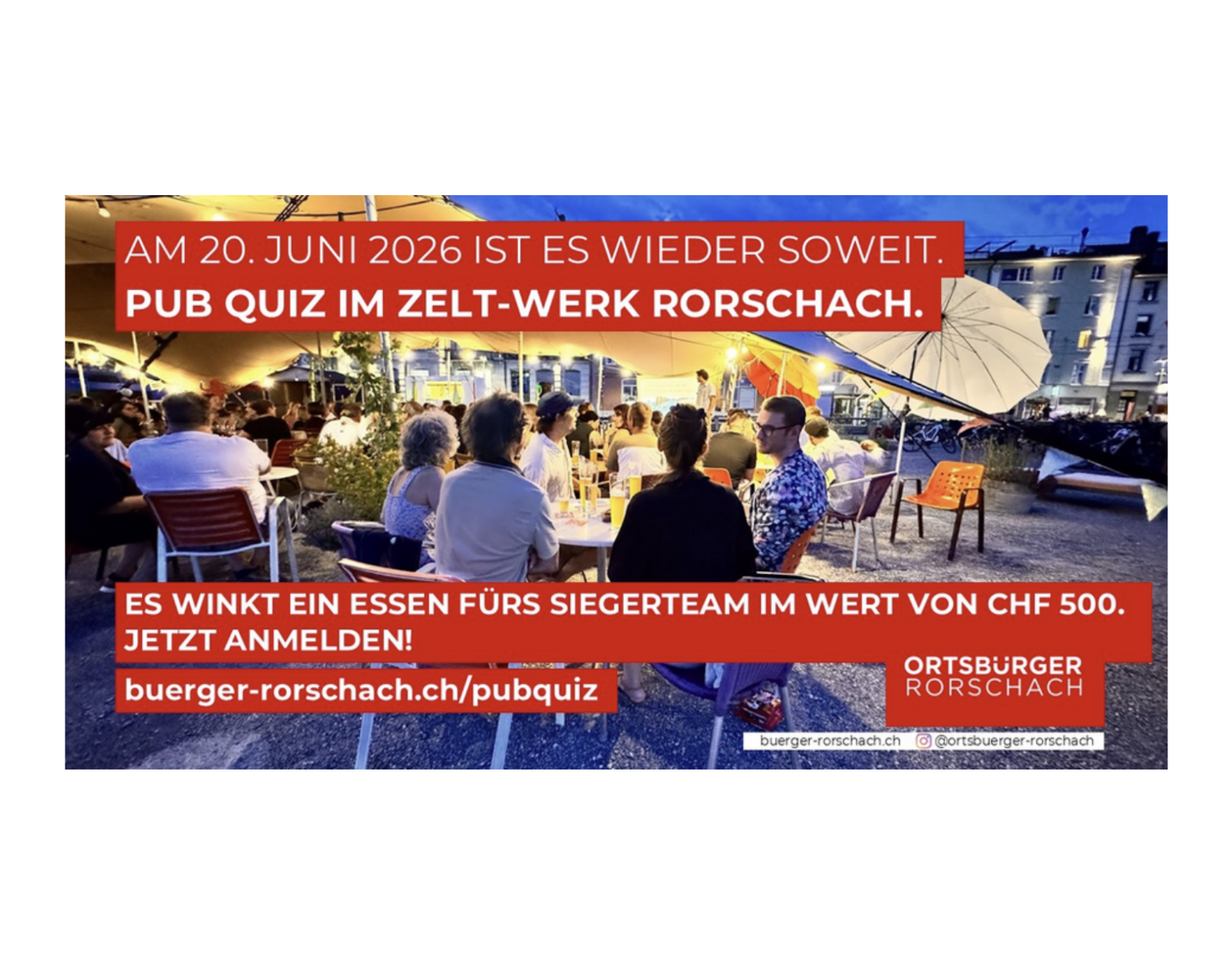 Am 20. Juni 2026 findet im „Zelt-Werk“ der dritte von der Ortsbürgergemeinde Rorschach gesponserte „Pub Quiz“-Abend statt. Zu gewinnen gibt es wieder einen Essensgutschein fürs ganze Team im Wert von CHF 500. Dieser Quizabend steht allen offen. Anmelden dazu kann man sich hier. Das Zelt-Werk öffnet am 1. Mai 2026 den Betrieb.