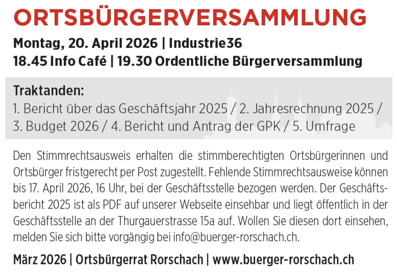 Exakt 2 Monate vorher, am 20. April 2026, findet die ordentliche Bürgerversammlung der Ortsbürgergemeinde Rorschach in der Industrie36 statt. Den Geschäftsbericht findet man hier.