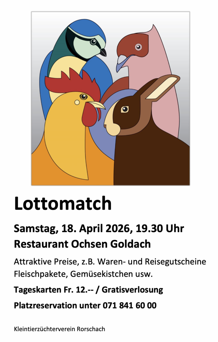 Kleintierzüchterverein Rorschach lädt zum LottomatchThemen:GoldachKulturRorschach 9. April 2026 - 05:05Und zwar am Samstag, 18. April 2026, ab 19.30 Uhr im Restaurant Ochsen in Goldach.Teilen mit: Einen Link per E-Mail an einen Freund senden (Wird in neuem Fenster geöffnet) E-Mail Drucken (Wird in neuem Fenster geöffnet) Drucken Auf Facebook teilen (Wird in neuem Fenster geöffnet) Facebook Auf X teilen (Wird in neuem Fenster geöffnet) X Auf WhatsApp teilen (Wird in neuem Fenster geöffnet) WhatsApp Gefällt mir:Gefällt mir Wird geladen …Newsletter abonnieren Bitte dieses Feld leer lassenBitte wähle, ob Du über jeden neuen Beitrag sofort oder lieber jeden Morgen gegen 9 Uhr eine Zusammenfassung der neusten Beiträge erhalten möchtest.Liste(n) auswählen: Neues vom Echo (Zusammenfassung) Neues vom Echo (Sofortbenachrichtigung) Dieses Feld wird benötigt.Prüfen Sie Ihren Posteingang und den Spamordner, um Ihr Abonnement zu bestätigen.