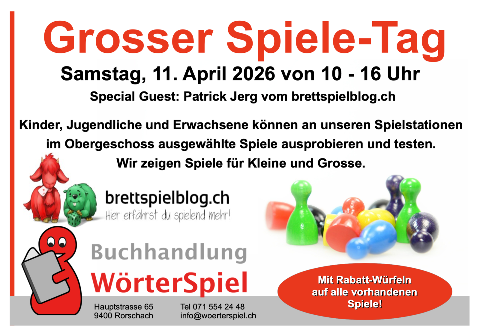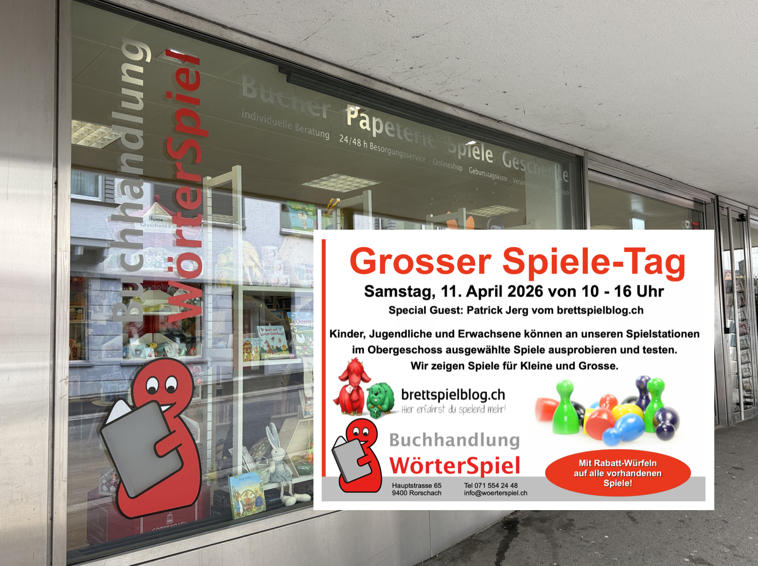 Morgen Samstag findet der Spiele-Tag in der Rorschacher Buchhandlung „WörterSpiel“ statt. Zu Gast ist Patrick Jerg vom brettspielblog.ch. Von 10 Uhr bis 16 Uhr werden wieder tolle neue Spiele im Obergeschoss gezeigt.