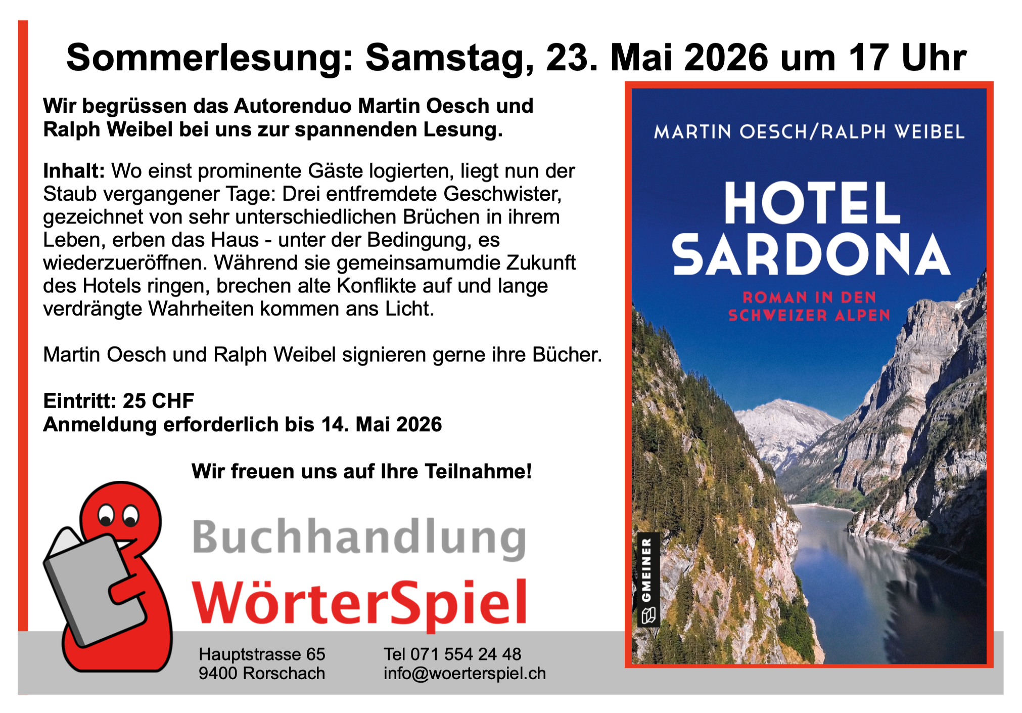 Und ein nächster literarischer Leckerbissen ist auch schon in der Pipeline. Die Sommerlesung findet am Samstag 23. Mai 2026 um 17 Uhr statt. Lesung aus: Hotel Sardona vom Autorenduo Martin Oesch und Ralph Weibel. Eintritt: 25 CHF. Anmeldung erforderlich bis 14. Mai 2026.