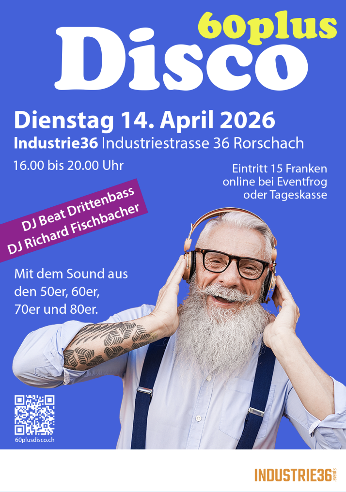 Erfahrene DJs sorgen für authentische Tanzmomente und auch Pausen sind willkommen: sitzen, etwas trinken und miteinander plaudern. Die 60plusDisco finden nicht an Wochenenden statt; sondern unter der Woche. Next time in Rorschach: Kommenden Dienstag, 14. April 2026, von 16 bis 20 Uhr. Also zu Zeiten, an denen die tanzfreudigen ab 60 auch Zeit haben. Die 60plusDisco ist ein Treffpunkt für Tanzfreude, Musik und Gemeinschaft – perfekt für alle, die auch jenseits der 60 das Ausgehen genießen möchten. (Text/Plakat: pd 60pd bd)