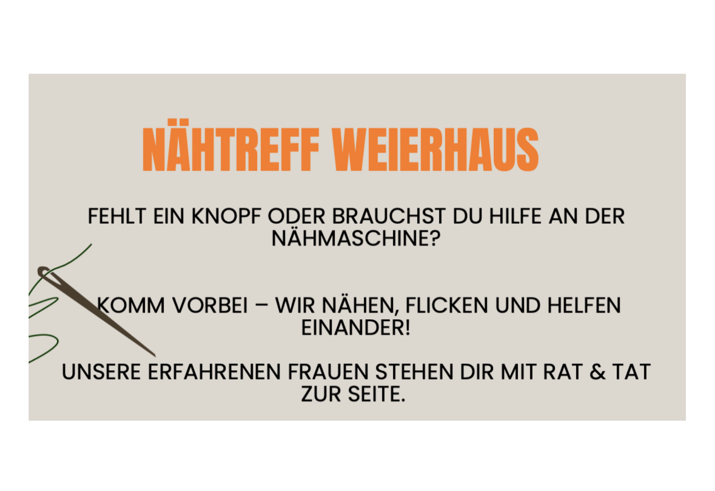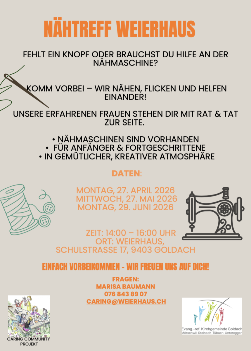 Geselliger Nähtreff im Weierhaus in GoldachThemen:GoldachKulturPartnerRef. Goldach 13. April 2026 - 05:20Die wichtigsten Infos findet man auf dem Flyer unten und mehr über die Caring Community Weierhaus online hier.Teilen mit: Einen Link per E-Mail an einen Freund senden (Wird in neuem Fenster geöffnet) E-Mail Drucken (Wird in neuem Fenster geöffnet) Drucken Auf Facebook teilen (Wird in neuem Fenster geöffnet) Facebook Auf X teilen (Wird in neuem Fenster geöffnet) X Auf WhatsApp teilen (Wird in neuem Fenster geöffnet) WhatsApp Gefällt mir:Gefällt mir Wird geladen …Newsletter abonnieren Bitte dieses Feld leer lassenBitte wähle, ob Du über jeden neuen Beitrag sofort oder lieber jeden Morgen gegen 9 Uhr eine Zusammenfassung der neusten Beiträge erhalten möchtest.Liste(n) auswählen: Neues vom Echo (Zusammenfassung) Neues vom Echo (Sofortbenachrichtigung) Dieses Feld wird benötigt.Prüfen Sie Ihren Posteingang und den Spamordner, um Ihr Abonnement zu bestätigen.