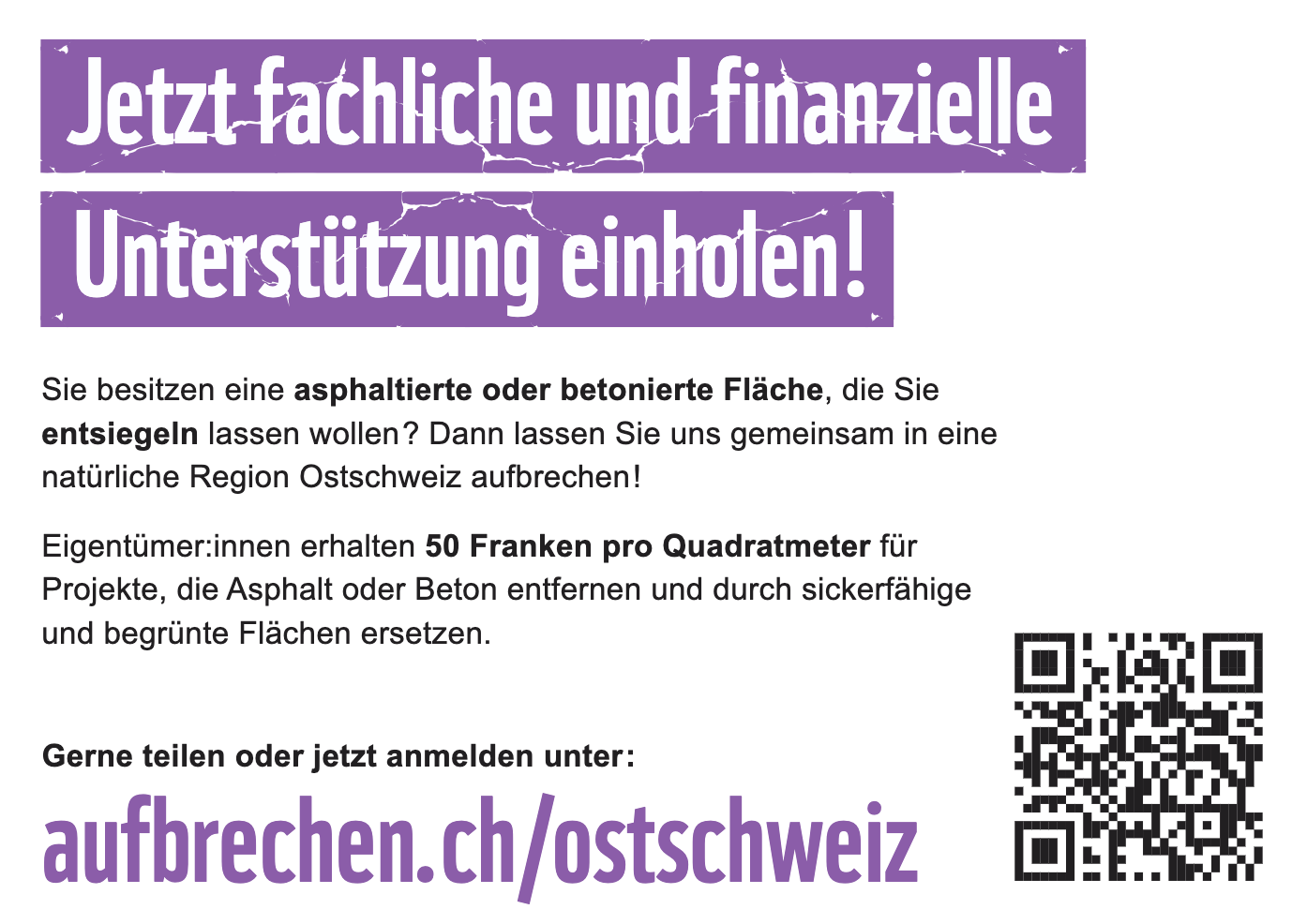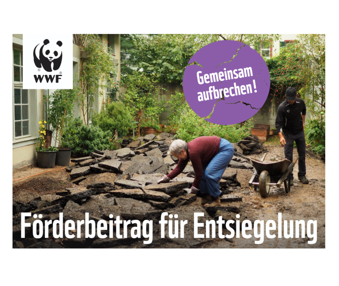 Der WWF Ostschweiz setzt sich dafür ein, versiegelte Böden in den Kantonen Thurgau, St. Gallen, Appenzell Innerrhoden und Ausserrhoden zu reduzieren. Das Ziel davon sind kühlere Siedlungsräume, mehr Grün und funktionierende Wasserkreisläufe. Mit dem Projekt „Gemeinsam aufbrechen“ werden Grundstückeigentümer:innen in Rorschach finanziell unterstützt, Asphalt oder Beton zu entfernen und durch sickerfähige und begrünte Flächen zu ersetzen.