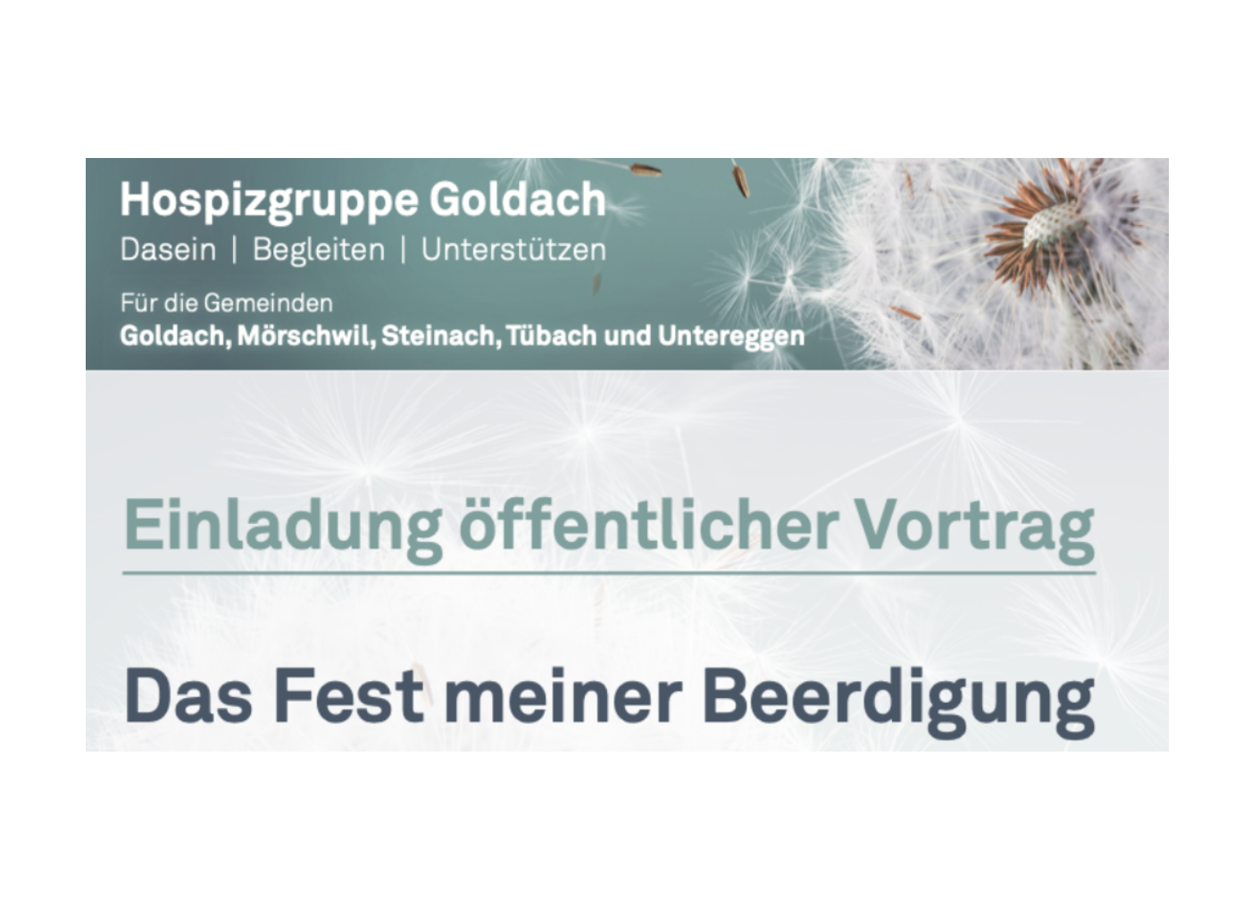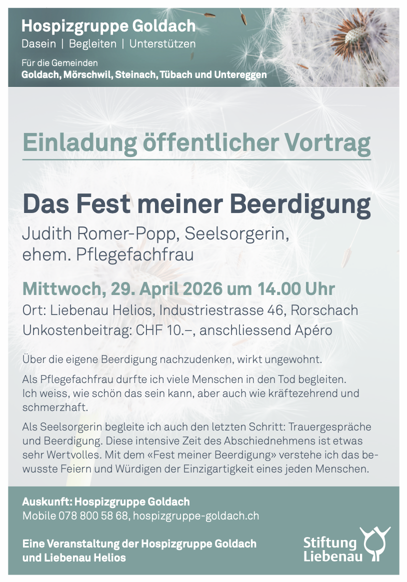 Vormerken: Die Hospizgruppe Goldach lädt am Mittwoch, 29. April 2026, zu einem öffentlichen Vortrag ins Helios an der Industriestrasse 46 in Rorschach ein. Seelsorgerin Judith Romer-Popp wird als ehemalige Pflegefachfrau zum Thema „Das Fest meiner Beerdigung“ sprechen. Beginn ist um 14 Uhr, anschliessend wird ein Apéro offeriert. Mehr Infos findet man auf dem Flyer unten.