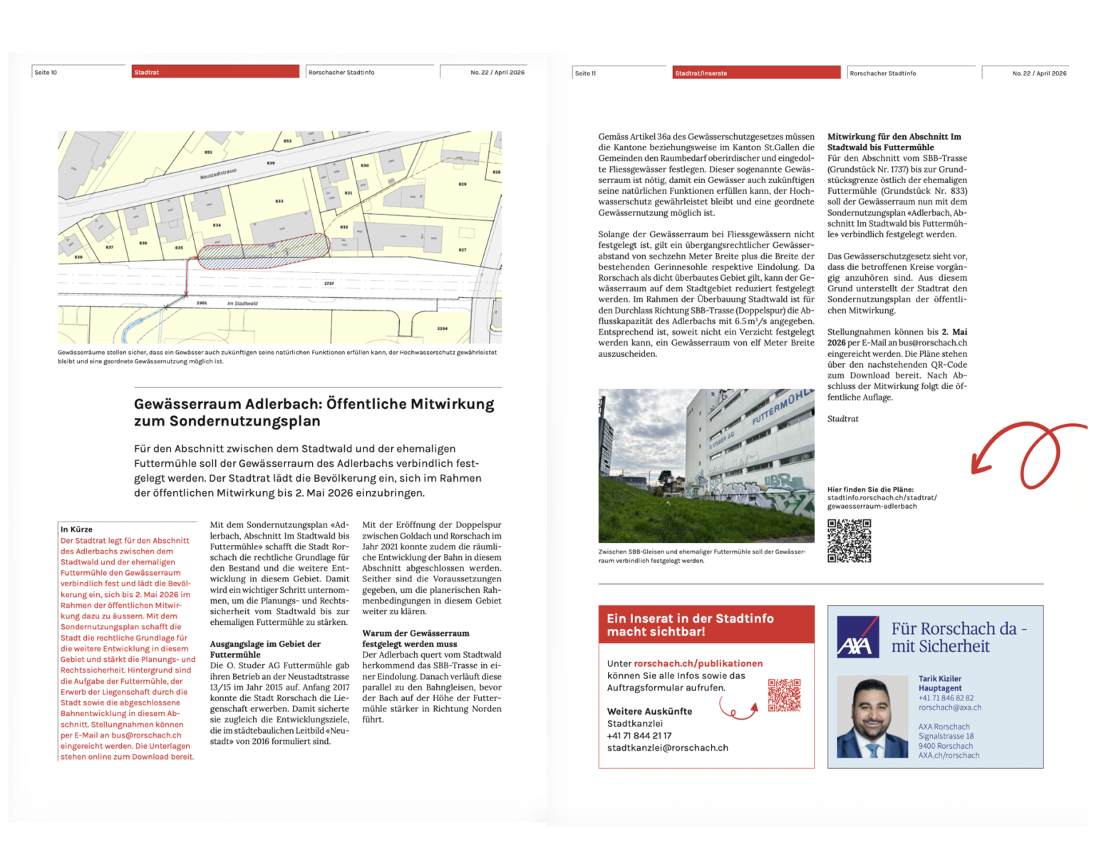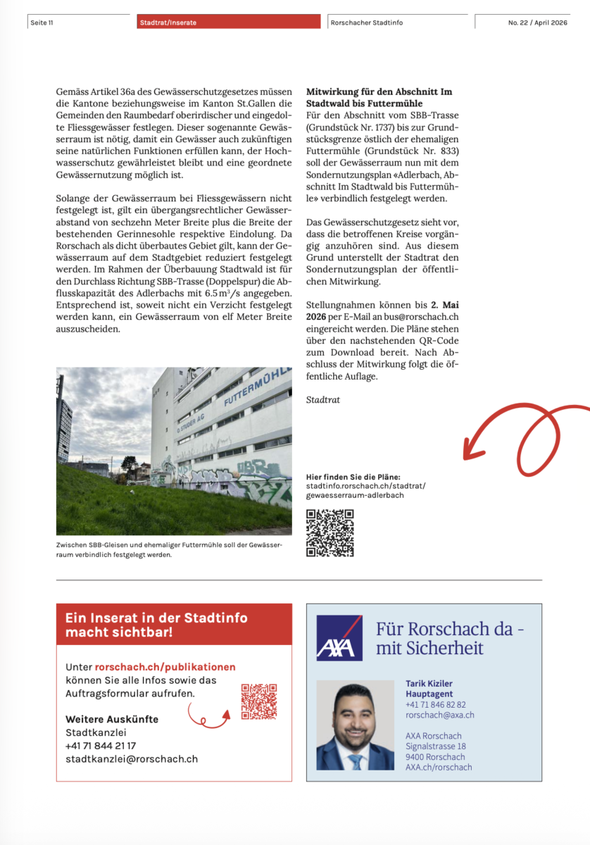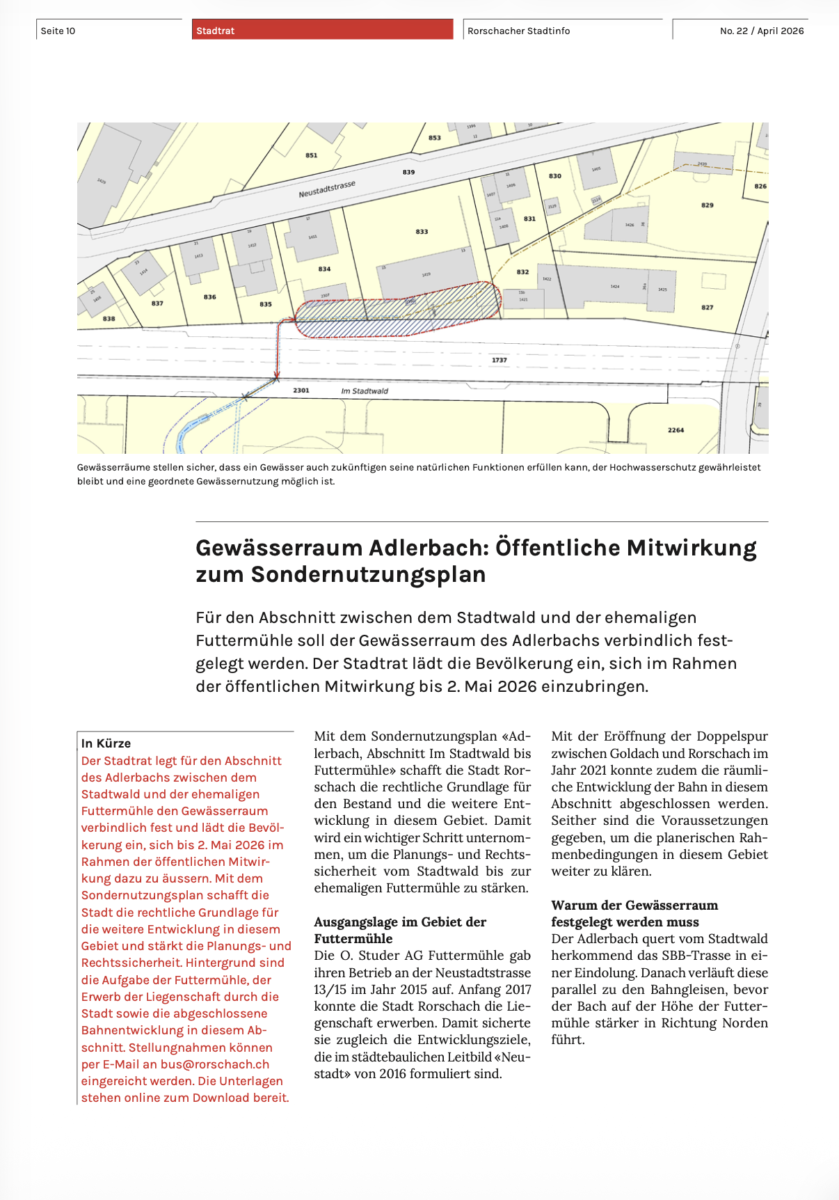 Aus den soeben verteilten Rorschacher Stadtinfos (zu finden auf den Seiten 10 und 11): Der Stadtrat legt für den Abschnitt des Adlerbachs zwischen dem Stadtwald und der ehemaligen Futtermühle den Gewässerraum verbindlich fest und lädt die Bevölkerung ein, sich bis 2. Mai 2026 im Rahmen der öffentlichen Mitwirkung dazu zu äussern. Mit dem Sondernutzungsplan schafft die Stadt die rechtliche Grundlage für die weitere Entwicklung in diesem Gebiet und stärkt die Planungs- und Rechtssicherheit. Hintergrund sind die Aufgabe der Futtermühle, der Erwerb der Liegenschaft durch die Stadt sowie die abgeschlossene Bahnentwicklung in diesem Abschnitt. Stellungnahmen können per E-Mail an bus@rorschach.ch eingereicht werden. Die Unterlagen stehen online zum Download bereit. Online findet man den ganzen Beitrag auch hier. (Text: pd sk)