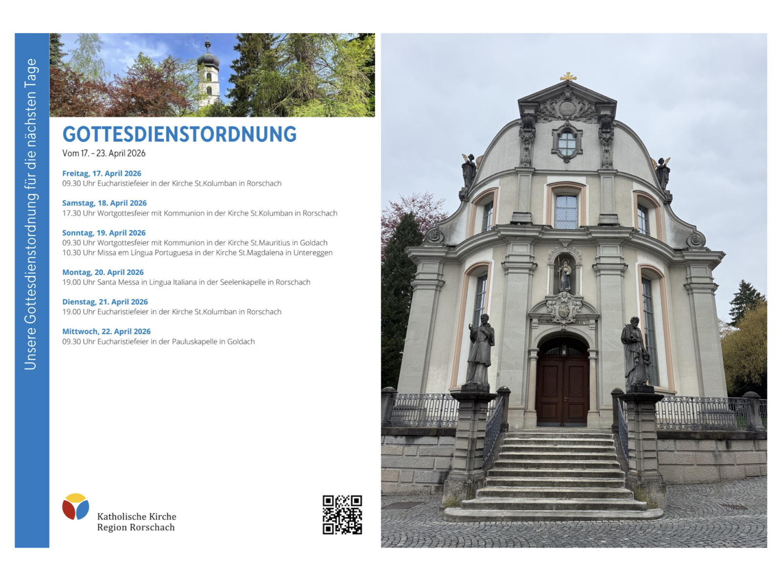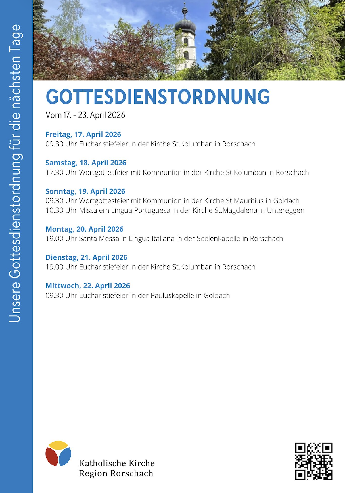 Gottesdienstordnung der KKRR für die nächsten TageThemen:Kath. RorschachKulturPartnerRegionRorschach 17. April 2026 - 05:15Gilt ab heute Freitag bis Mittwoch, 22. April 2026. Mehr Informationen finden Interessierte immer auch hier und hier.Teilen mit: Einen Link per E-Mail an einen Freund senden (Wird in neuem Fenster geöffnet) E-Mail Drucken (Wird in neuem Fenster geöffnet) Drucken Auf Facebook teilen (Wird in neuem Fenster geöffnet) Facebook Auf X teilen (Wird in neuem Fenster geöffnet) X Auf WhatsApp teilen (Wird in neuem Fenster geöffnet) WhatsApp Gefällt mir:Gefällt mir Wird geladen …Newsletter abonnieren Bitte dieses Feld leer lassenBitte wähle, ob Du über jeden neuen Beitrag sofort oder lieber jeden Morgen gegen 9 Uhr eine Zusammenfassung der neusten Beiträge erhalten möchtest.Liste(n) auswählen: Neues vom Echo (Zusammenfassung) Neues vom Echo (Sofortbenachrichtigung) Dieses Feld wird benötigt.Prüfen Sie Ihren Posteingang und den Spamordner, um Ihr Abonnement zu bestätigen.