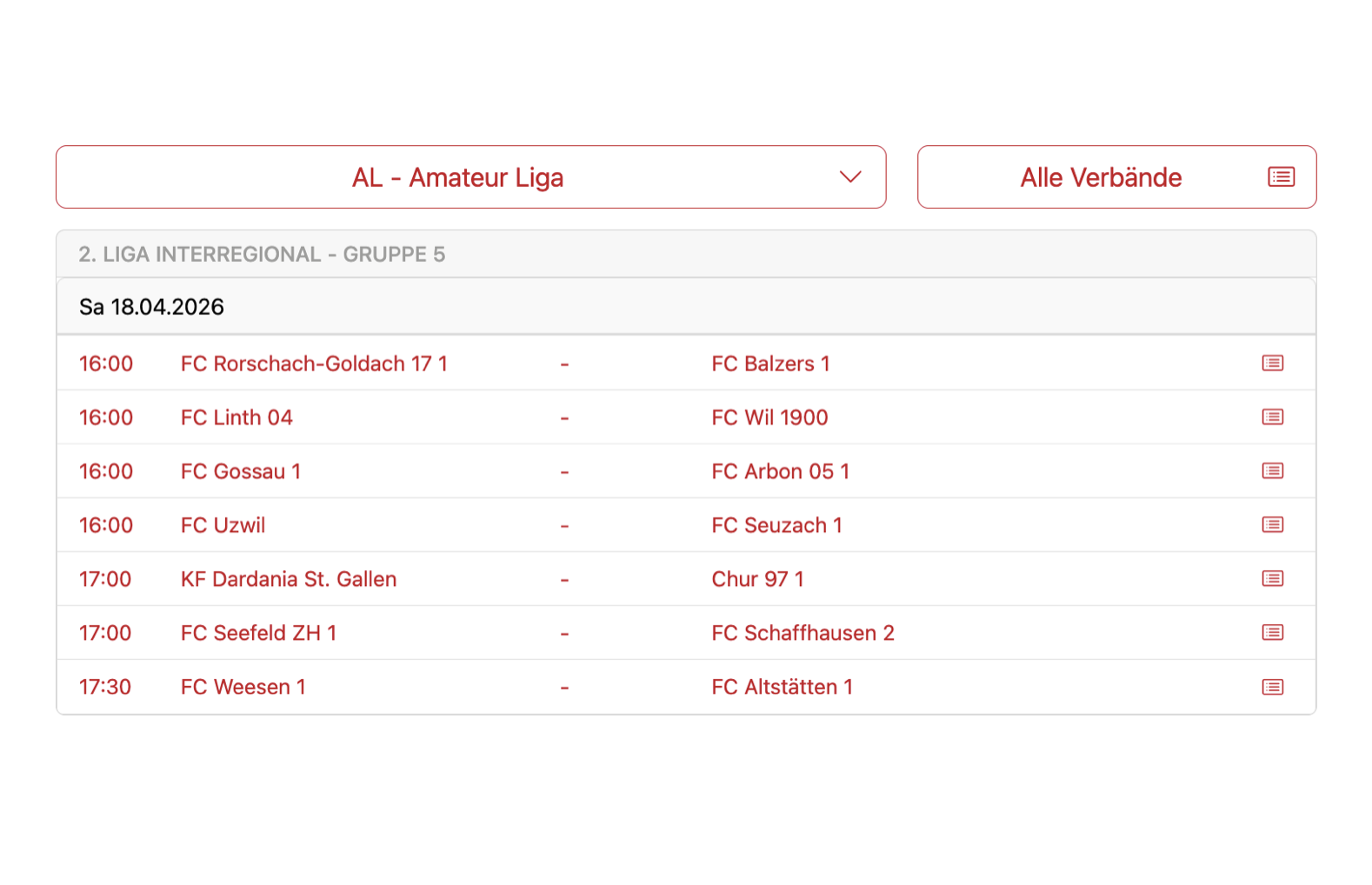 Die Spiele von heute in der FCRG17-GruppeThemen:FC Rorschach-Goldach 17 18. April 2026 - 05:25Unsere Fussballer empfangen heute um 16 Uhr auf Kellen den FC Balzers – sozusagen fast ein Länderspiel…Teilen mit: Einen Link per E-Mail an einen Freund senden (Wird in neuem Fenster geöffnet) E-Mail Drucken (Wird in neuem Fenster geöffnet) Drucken Auf Facebook teilen (Wird in neuem Fenster geöffnet) Facebook Auf X teilen (Wird in neuem Fenster geöffnet) X Auf WhatsApp teilen (Wird in neuem Fenster geöffnet) WhatsApp Gefällt mir:Gefällt mir Wird geladen …Newsletter abonnieren Bitte dieses Feld leer lassenBitte wähle, ob Du über jeden neuen Beitrag sofort oder lieber jeden Morgen gegen 9 Uhr eine Zusammenfassung der neusten Beiträge erhalten möchtest.Liste(n) auswählen: Neues vom Echo (Zusammenfassung) Neues vom Echo (Sofortbenachrichtigung) Dieses Feld wird benötigt.Prüfen Sie Ihren Posteingang und den Spamordner, um Ihr Abonnement zu bestätigen.