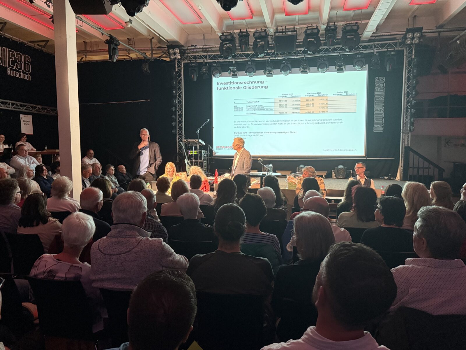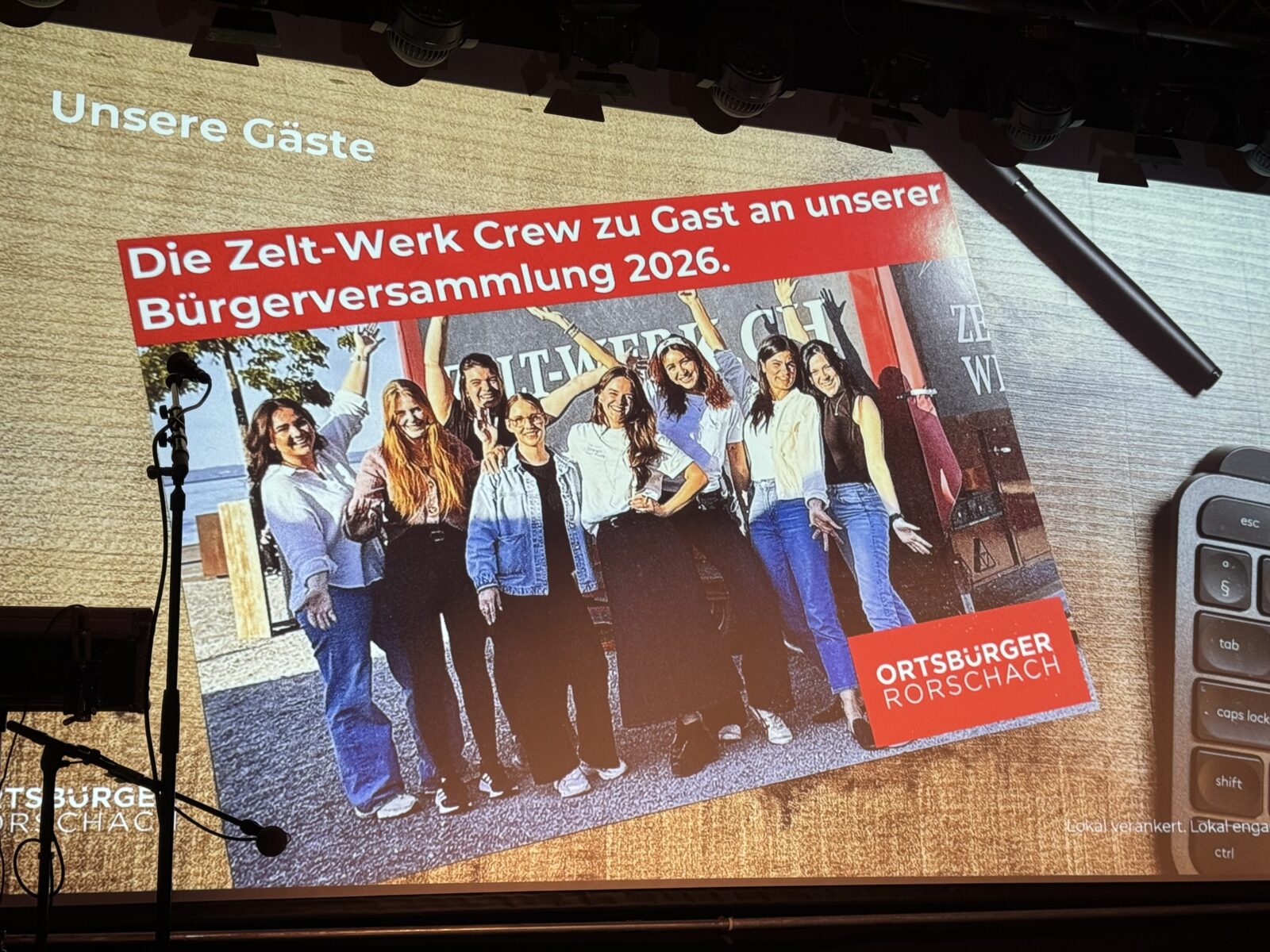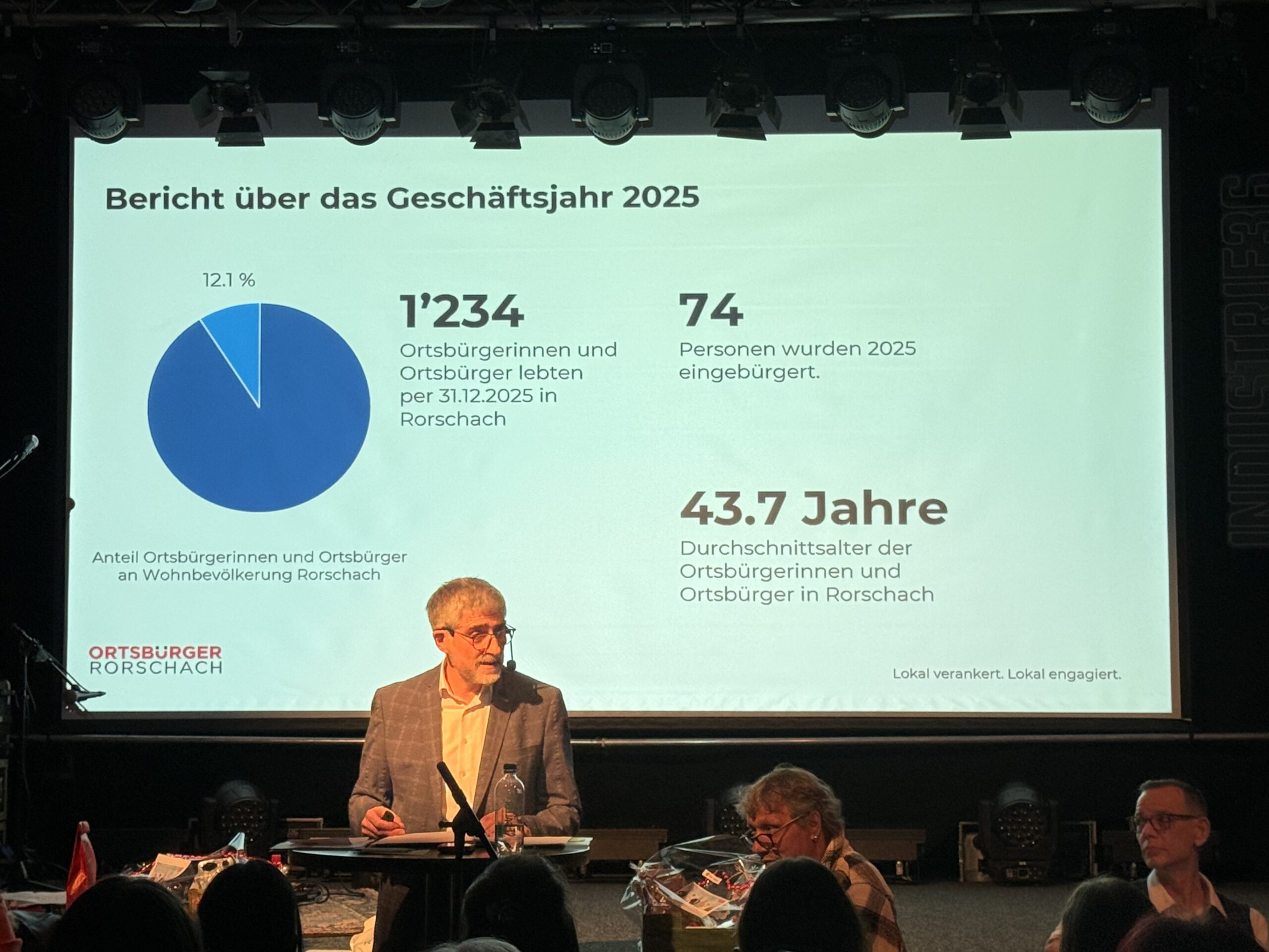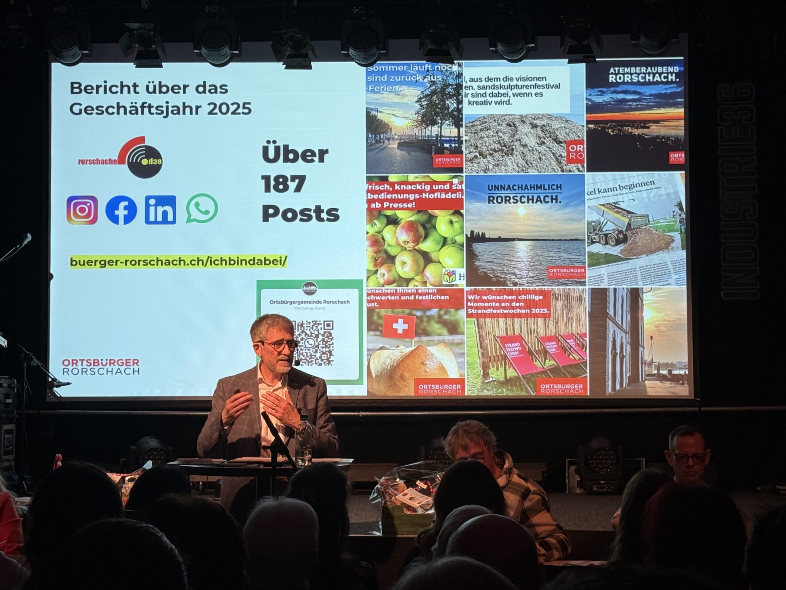 Am Montagabend haben die Ortsbürger Rorschach ihre ordentliche Bürgerversammlung durchgeführt. 136 Personen folgten der Einladung in die Industrie36. Präsident Claudio Vuono führte zielstrebig durch die Versammlung und die Stimmberechtigten folgten allen Anträgen. Immer im Zentrum der bekannte Slogan: „Ortsbürger sein. Ein Statement. Liebe zu Rorschach“. Speziell geehrt wurde das Zelt-Werk-Team rund um Michèle Müller und Kim Boppart, die ab dem 1. Mai 2026 wieder den Hafenplatz bereichern. Und auch der neue Badhütte-Verein konnte sich kurz vorstellen. Hier einige Bilder von dieser Bürgerversammlung. Den ganzen Geschäftsbericht finden Interessierte hier. Und den Bericht der Ortsbürger über diese Versammlung hier.