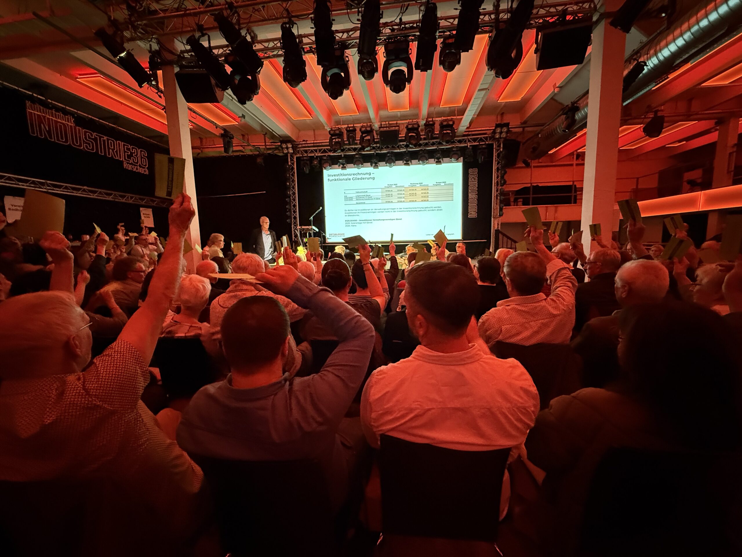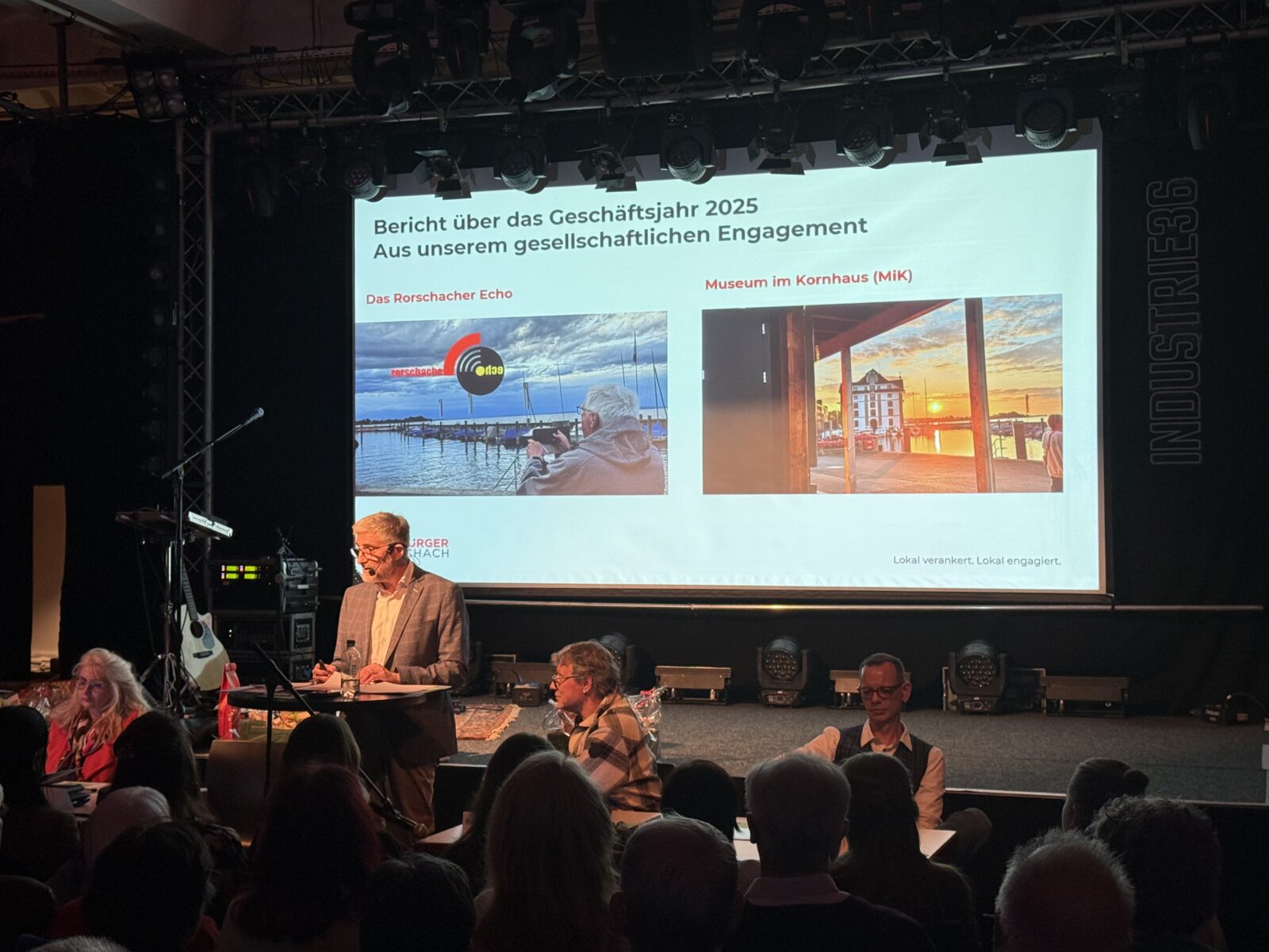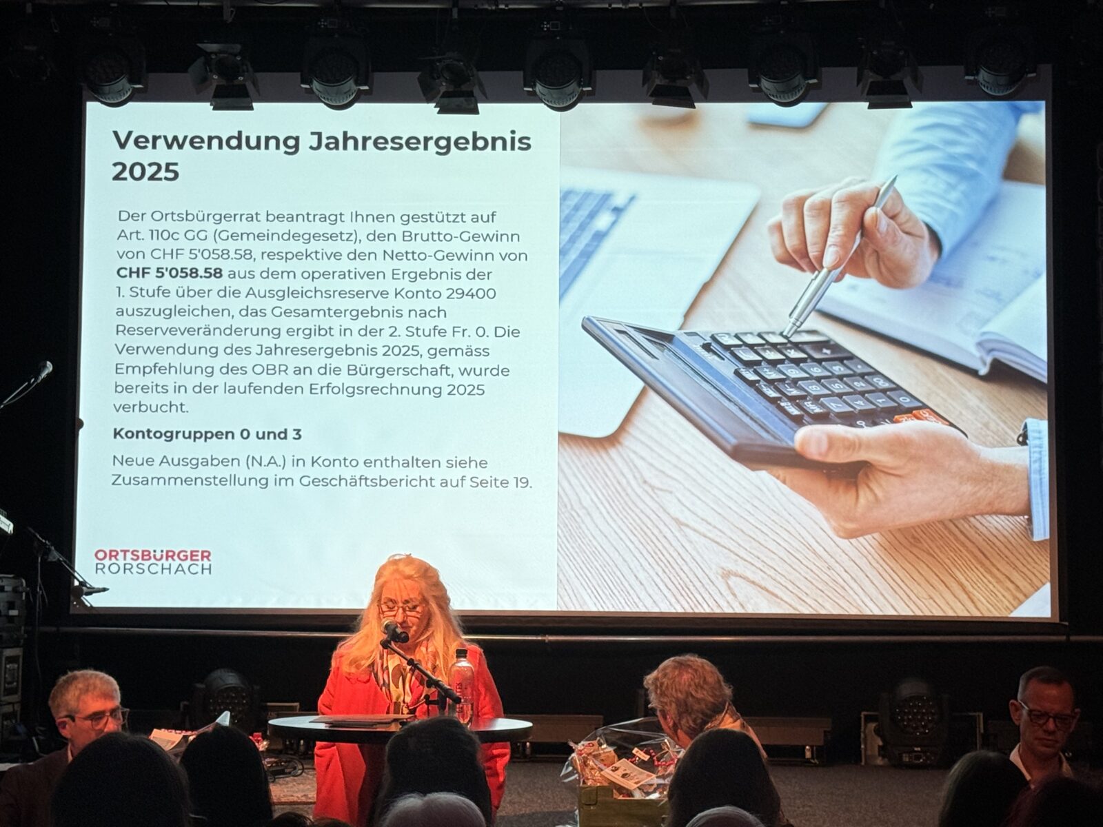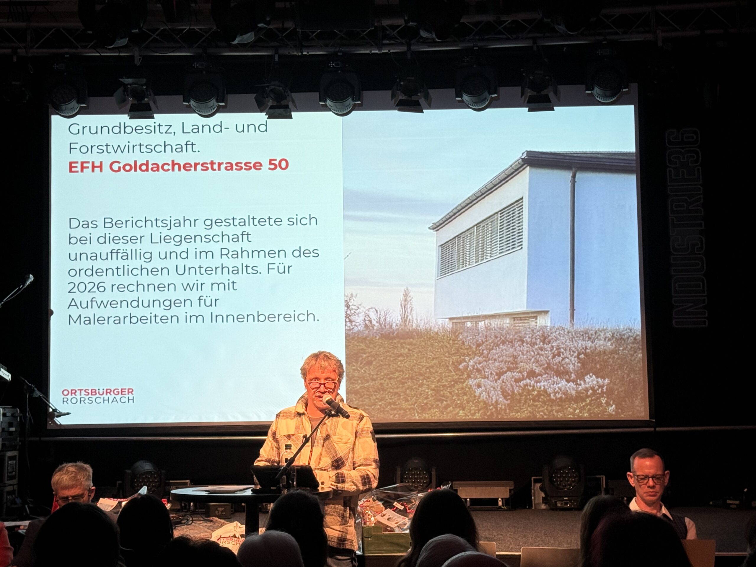 Am Montagabend haben die Ortsbürger Rorschach ihre ordentliche Bürgerversammlung durchgeführt. 136 Personen folgten der Einladung in die Industrie36. Präsident Claudio Vuono führte zielstrebig durch die Versammlung und die Stimmberechtigten folgten allen Anträgen. Immer im Zentrum der bekannte Slogan: „Ortsbürger sein. Ein Statement. Liebe zu Rorschach“. Speziell geehrt wurde das Zelt-Werk-Team rund um Michèle Müller und Kim Boppart, die ab dem 1. Mai 2026 wieder den Hafenplatz bereichern. Und auch der neue Badhütte-Verein konnte sich kurz vorstellen. Hier einige Bilder von dieser Bürgerversammlung. Den ganzen Geschäftsbericht finden Interessierte hier. Und den Bericht der Ortsbürger über diese Versammlung hier.