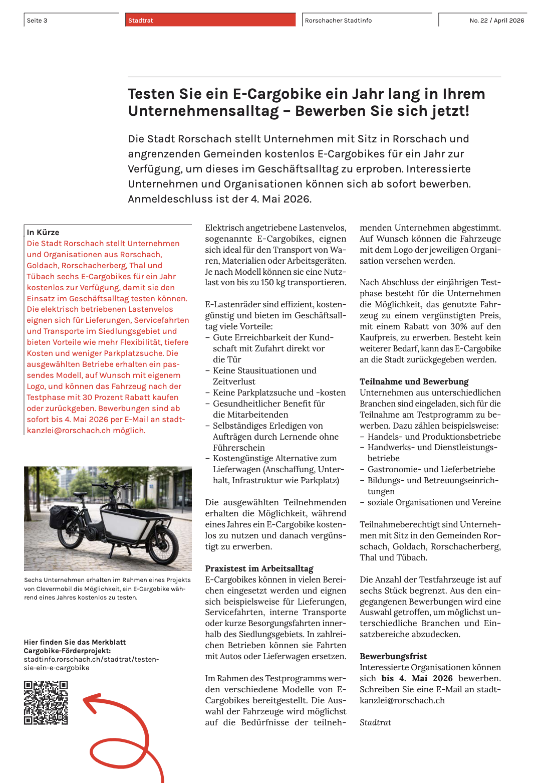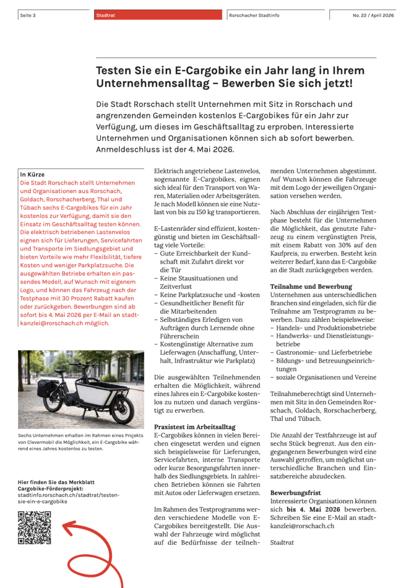 kostenlos zur Verfügung, damit sie den Einsatz im Geschäftsalltag testen können. Die elektrisch betriebenen Lastenvelos eignen sich für Lieferungen, Servicefahrten und Transporte im Siedlungsgebiet und bieten Vorteile wie mehr Flexibilität, tiefere Kosten und weniger Parkplatzsuche. Die ausgewählten Betriebe erhalten ein passendes Modell, auf Wunsch mit eigenem Logo, und können das Fahrzeug nach der Testphase mit 30 Prozent Rabatt kaufen oder zurückgeben. Bewerbungen sind ab sofort bis 4. Mai 2026 per E-Mail an stadtkanzlei@rorschach.ch möglich. (Text/Bild: pd sk)