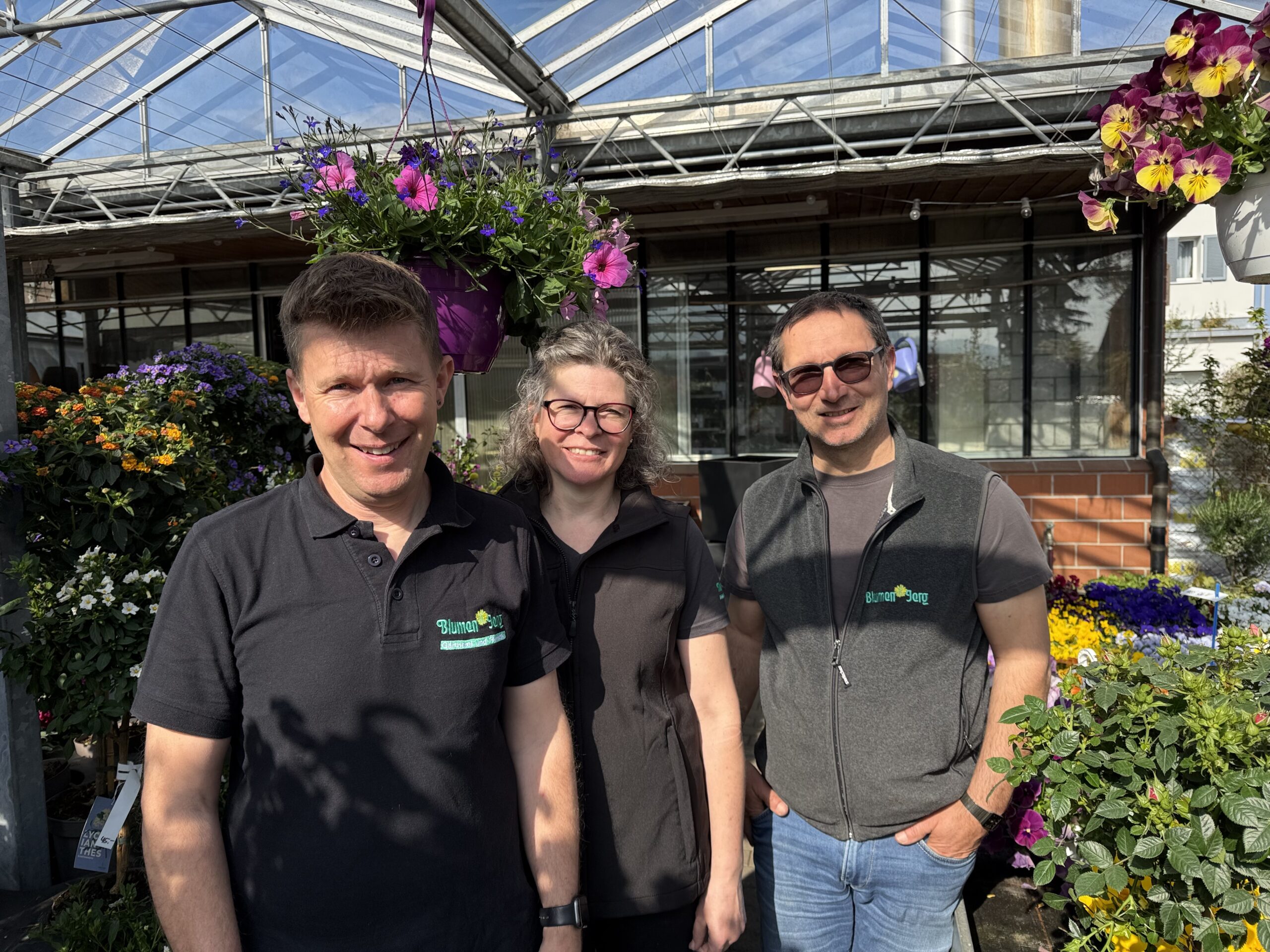 Das Bild zeigt von links nach rechts Martin Egger (Leitung Gärtnerei), Daniela Mannhart (Leitung Blumen Laden) und Benno Jerg (Inhaber).