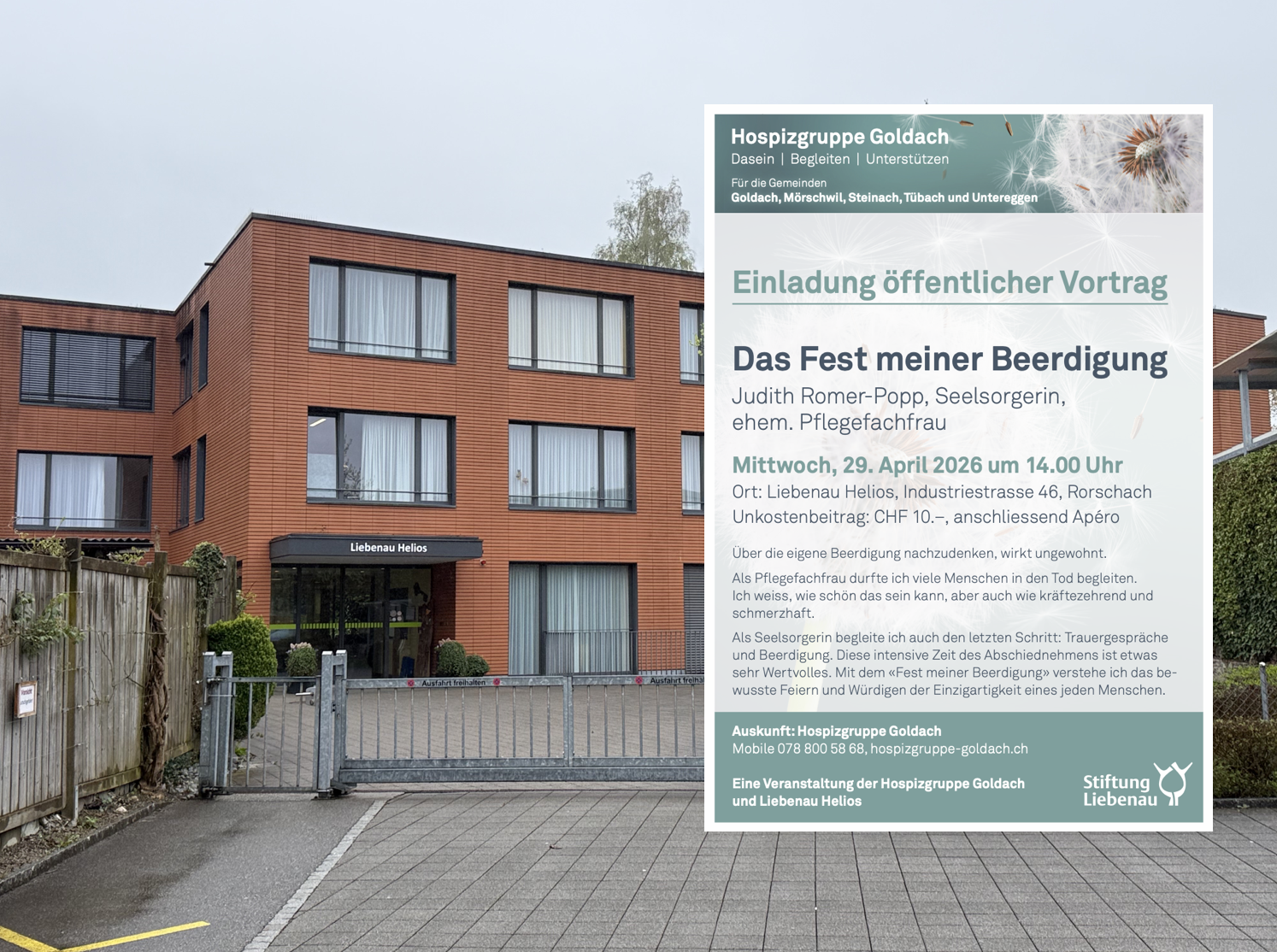 Die Hospizgruppe Goldach lädt kommenden Mittwoch, 29. April 2026, zu einem öffentlichen Vortrag ins Helios an der Industriestrasse 46 in Rorschach ein. Seelsorgerin Judith Romer-Popp wird als ehemalige Pflegefachfrau zum Thema „Das Fest meiner Beerdigung“ sprechen. Beginn ist um 14 Uhr, anschliessend wird ein Apéro offeriert. Mehr Infos findet man auf dem Flyer unten.