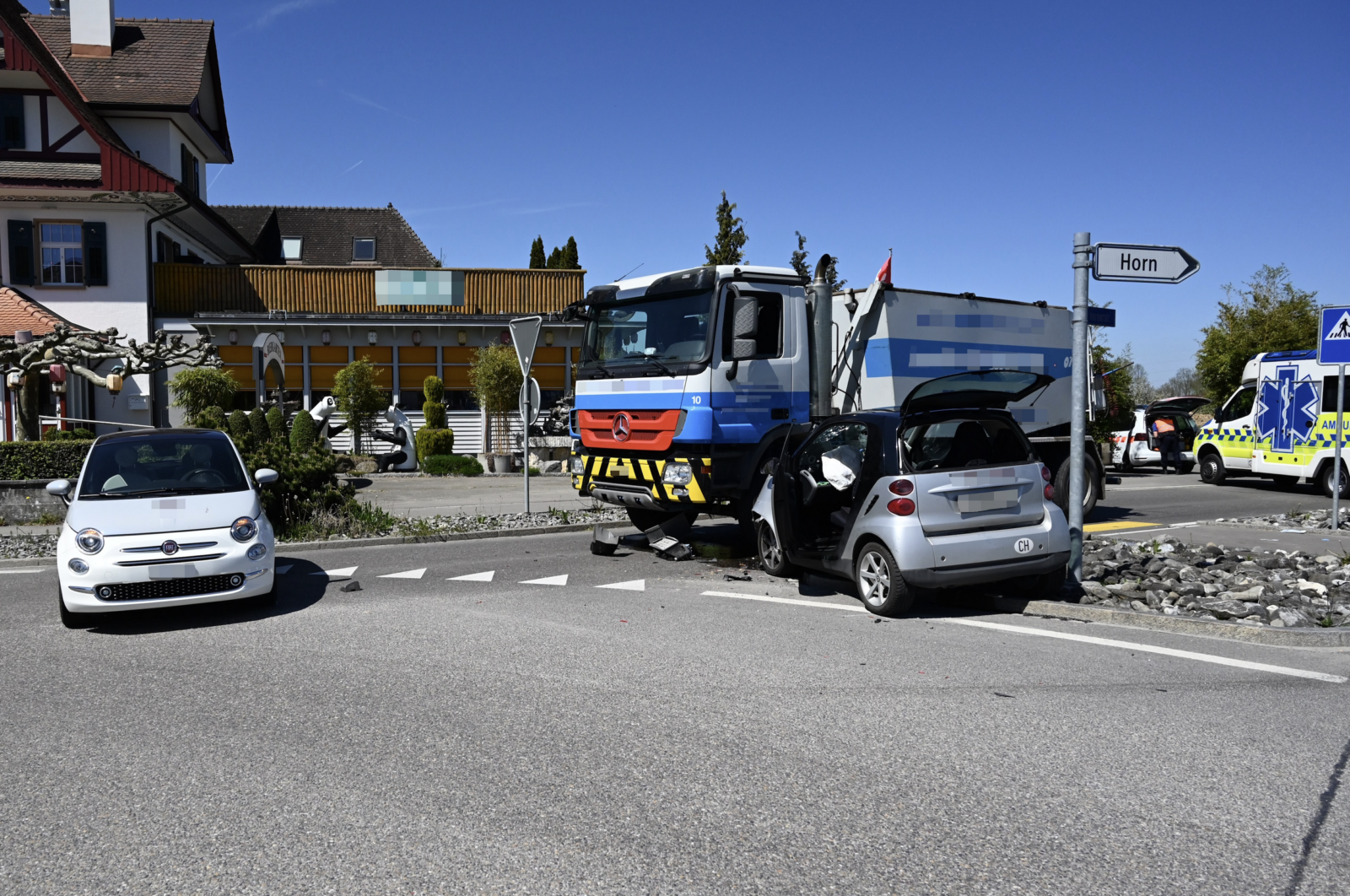Kurz nach 12:45 Uhr fuhr eine 71-jährige Frau mit ihrem Auto auf der Goldacherstrasse in Richtung Tübach. Gemäss aktuellen Erkenntnissen prallte sie mit ihrem Auto im Kreisverkehr in das Autoheck eines vor ihr fahrenden 56-jährigen Mannes. Durch den Aufprall wurde das Auto des 56-Jährigen weggeschoben. Er wurde leicht verletzt. Das Auto der 71-Jährigen kam nach einem weiteren Aufprall auf einen bei der Einmündung der Hornerstrasse stehenden Lastwagen zum Stillstand. Die 71-jährige Frau verstarb auf der Unfallstelle.