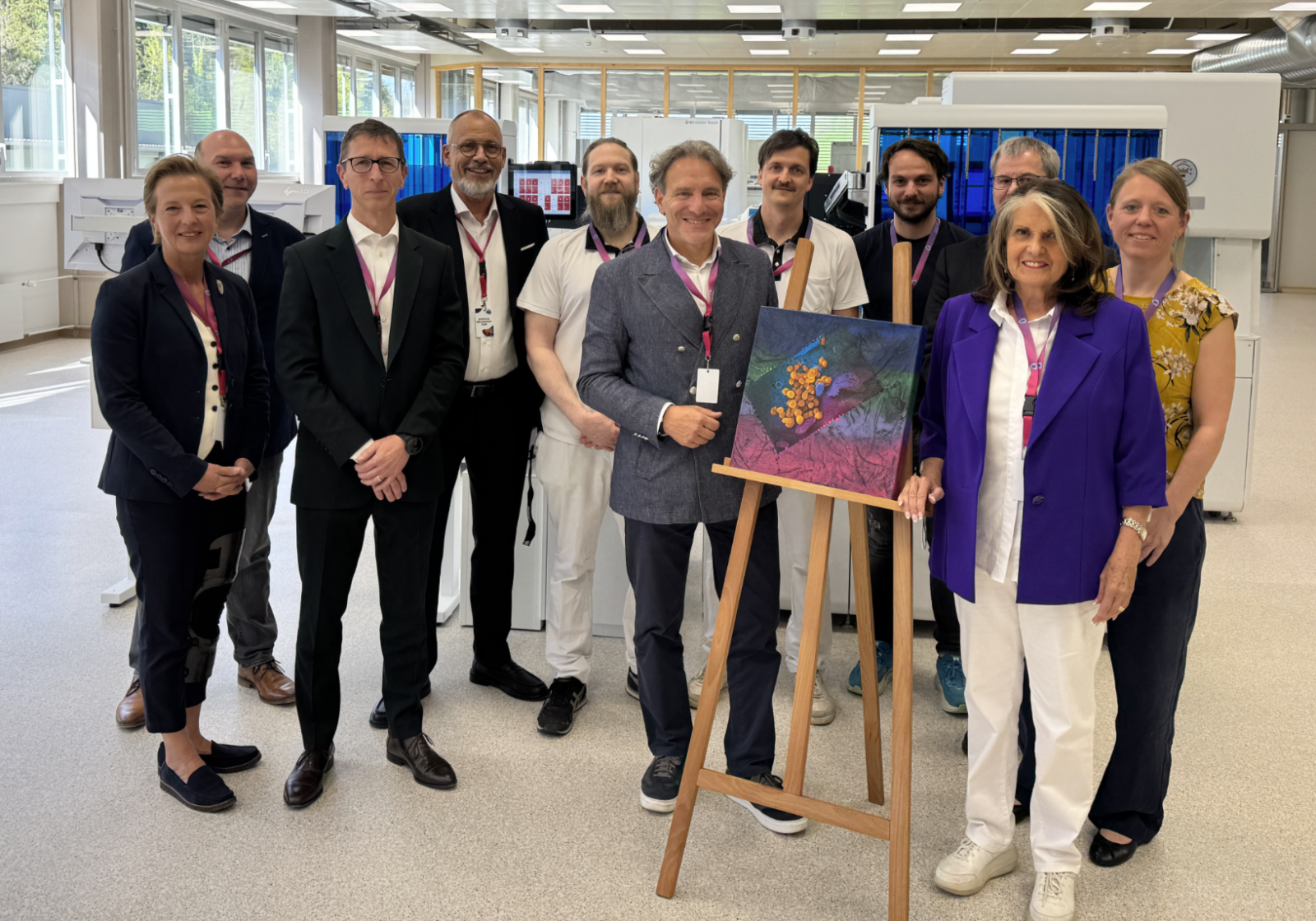 Labor Team hat am 23. April in Goldach eine neue vollautomatisierte Mikrobiologie eröffnet und die Inbetriebnahme mit einer Vernissage der Ostschweizer Künstlerin Susanna Gantner verbunden. Das Beitragsbild zeigt das Projektteam Mikrobiologie, Geschäftsleitungsmitglieder, Vertreter der Herstellerfirma BD und die Ostschweizer Künstlerin Susanna Gantner (zweite von rechts) vor dem eigens für Labor Team geschaffenen Werk in den Räumen der neuen Mikrobiologie.(v.l.n.r.): Eva Kath (BD), Stefan Saremba (BD), Philippe Villard (Waters Advanced Diagnostics), Thomas Brinkmann, Tobias Schmid (Mikrobiologie), Alain Cahen, Mirko Schnider (Mikrobiologie), Michael Wagner, David Klay (Waters Advanced Diagnostics), Susanna Gantner (Künstlerin) und Petra Wöhler (IT Projekte).