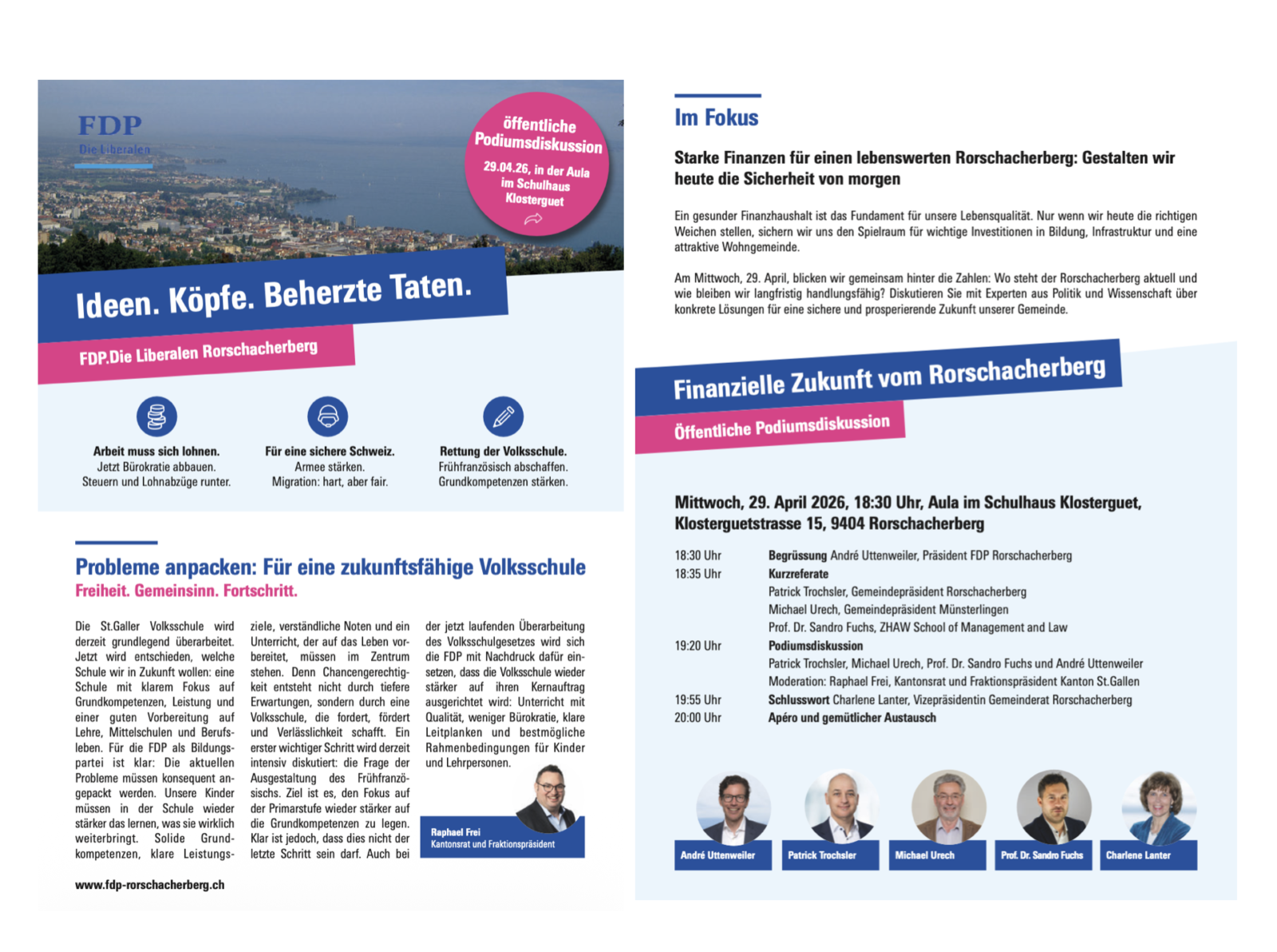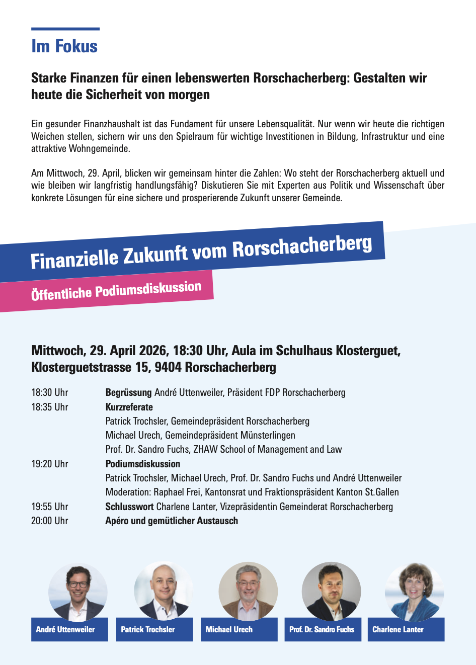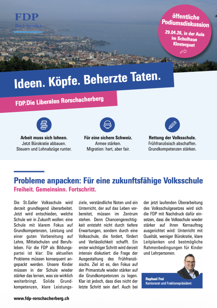 Die FDP-Rorschacherberg organisiert morgen Mittwochabend in der Aula im Schulhaus Klosterguet eine öffentliche Podiumsdiskussion. Im Zentrum steht die finanzielle Zukunft der Gemeinde Rorschacherberg. Beginn ist um 18:30 Uhr. Die wichtigsten Infos findet man auf dem Flyer unten: