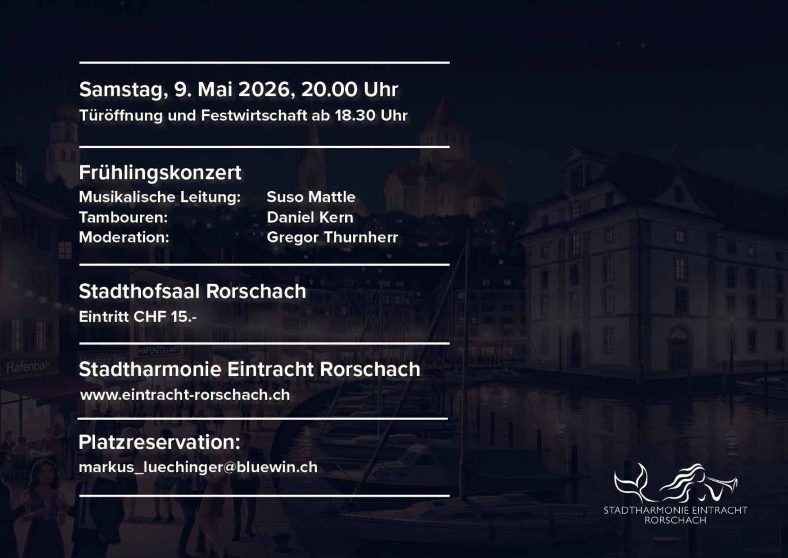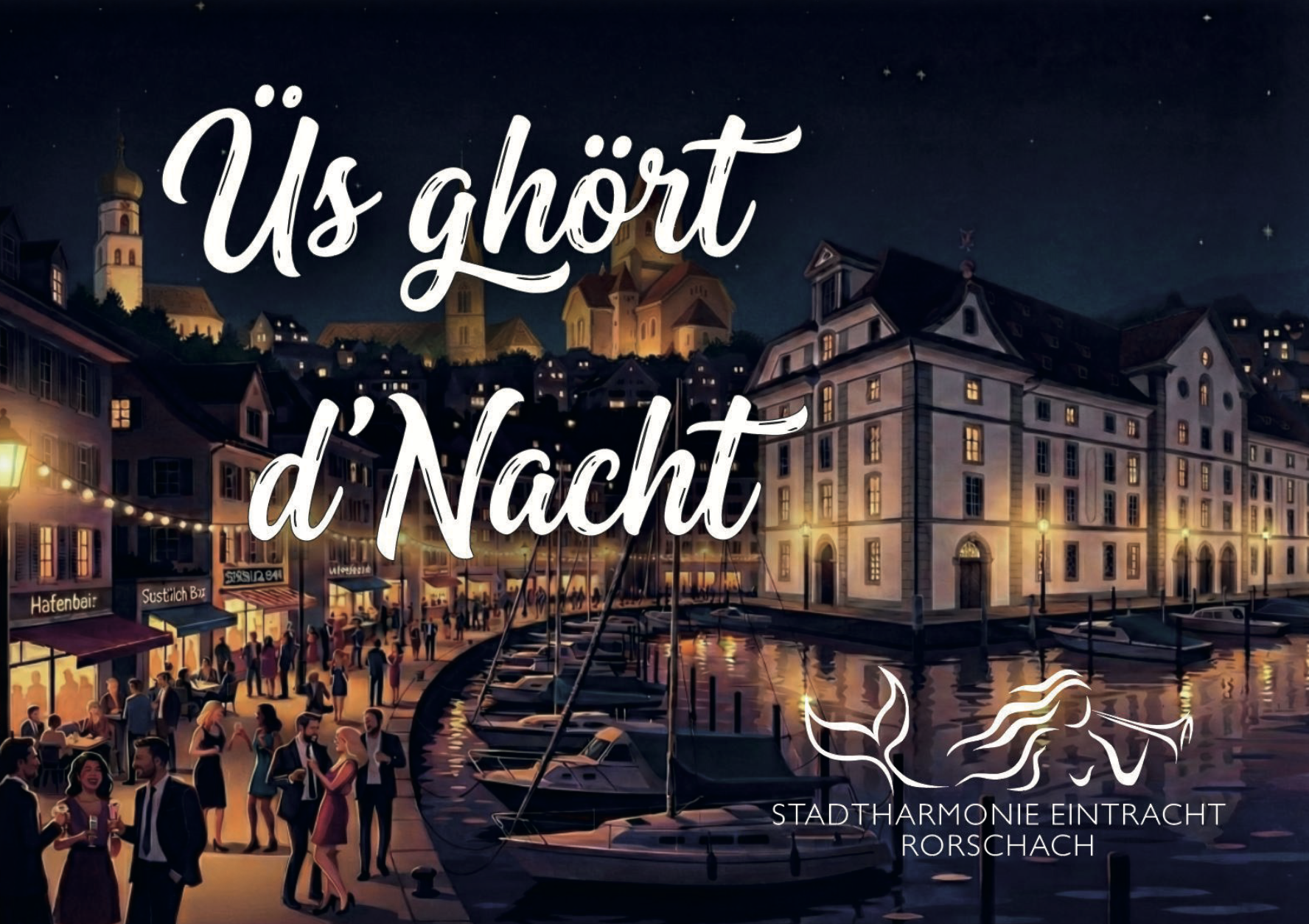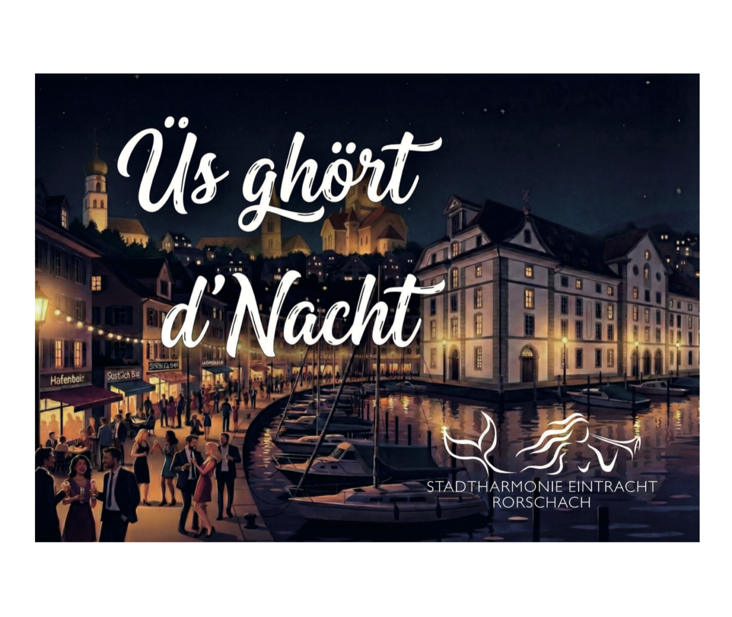 Die Stadtharmonie Eintracht Rorschach lädt am Samstag, 9. Mai 2026, zu ihrem Frühlingskonzert in den Stadthofsaal Rorschach ein. Unter dem Motto „Üs ghört d’Nacht“ steht ein Konzertabend, der die besondere Stimmung der Rorschacher Seepromenade musikalisch einfängt – vom sanften Übergang des Tages in die Nacht bis hin zur energiegeladenen Partystimmung.